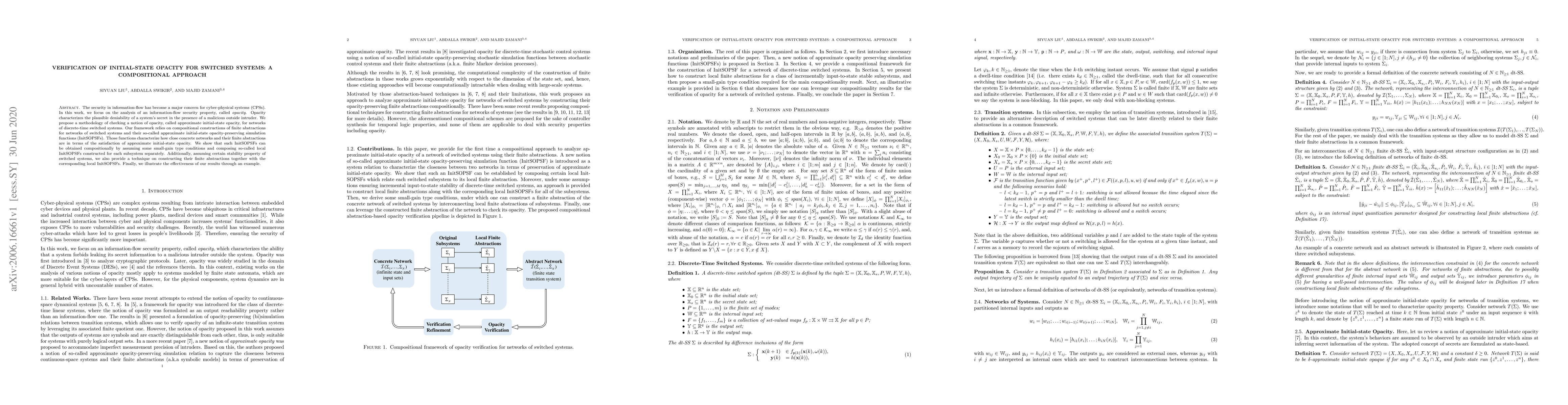 The security in information-flow has become a major concern for cyber-physical systems (CPSs). In this work, we focus on the analysis of an information-flow security property, called opacity. Opacity characterizes the plausible deniability of a system's secret in the presence of a malicious outside intruder. We propose a methodology of checking a notion of opacity, called approximate initial-state opacity, for networks of discrete-time switched systems. Our framework relies on compositional constructions of finite abstractions for networks of switched systems and their so-called approximate initial-state opacity-preserving simulation functions (InitSOPSFs). Those functions characterize how close concrete networks and their finite abstractions are in terms of the satisfaction of approximate initial-state opacity. We show that such InitSOPSFs can be obtained compositionally by assuming some small-gain type conditions and composing so-called local InitSOPSFs constructed for each subsystem separately. Additionally, assuming certain stability property of switched systems, we also provide a technique on constructing their finite abstractions together with the corresponding local InitSOPSFs. Finally, we illustrate the effectiveness of our results through an example.