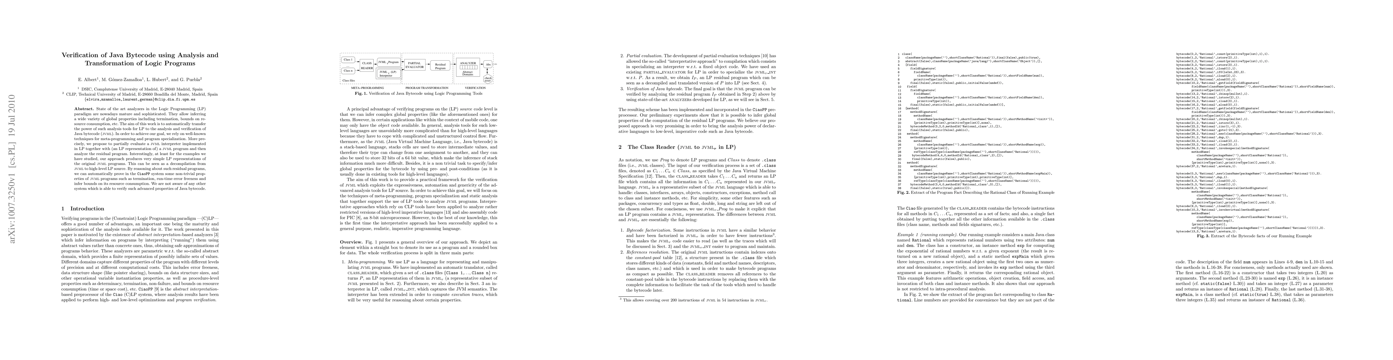 This paper proposes a method to leverage Logic Programming (LP) analysis tools for verifying Java bytecode (JVML) by partially evaluating a JVML interpreter and analyzing the resulting LP representation, achieving properties like termination and resource consumption bounds. No comparable system currently exists for verifying such advanced properties of Java bytecode.