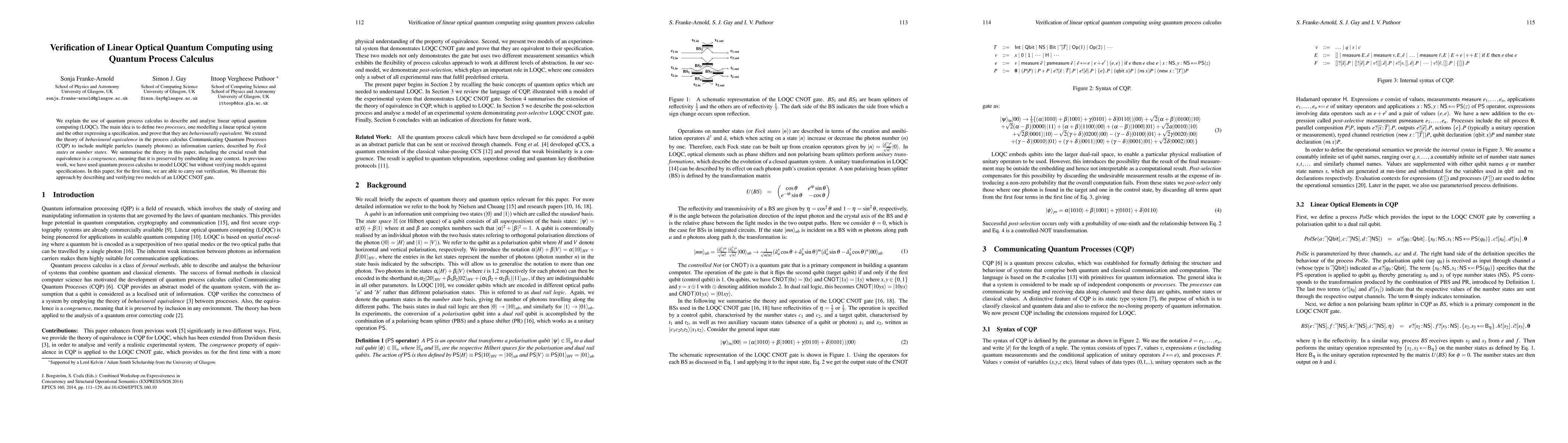 We explain the use of quantum process calculus to describe and analyse linear optical quantum computing (LOQC). The main idea is to define two processes, one modelling a linear optical system and the other expressing a specification, and prove that they are behaviourally equivalent. We extend the theory of behavioural equivalence in the process calculus Communicating Quantum Processes (CQP) to include multiple particles (namely photons) as information carriers, described by Fock states or number states. We summarise the theory in this paper, including the crucial result that equivalence is a congruence, meaning that it is preserved by embedding in any context. In previous work, we have used quantum process calculus to model LOQC but without verifying models against specifications. In this paper, for the first time, we are able to carry out verification. We illustrate this approach by describing and verifying two models of an LOQC CNOT gate.