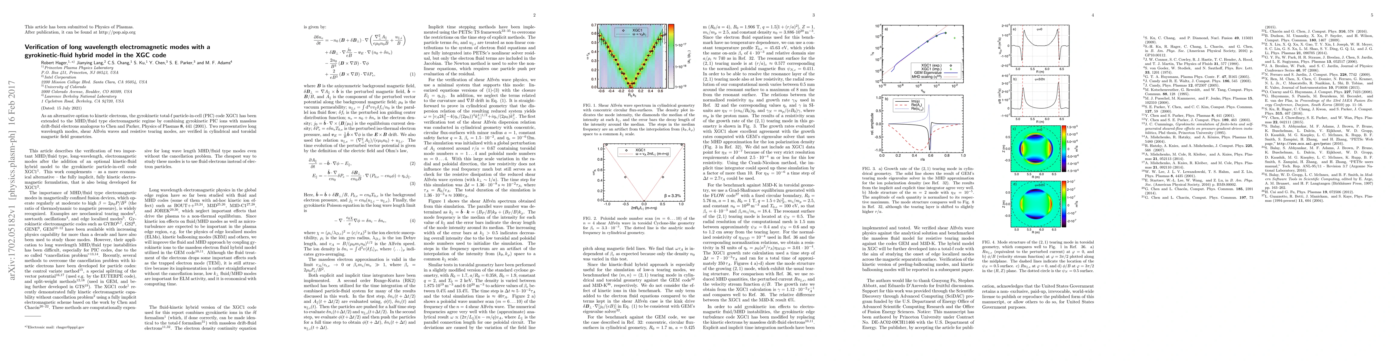 This paper verifies long wavelength electromagnetic modes, such as shear Alfvén waves and resistive tearing modes, using a gyrokinetic-fluid hybrid model in the XGC code, which combines gyrokinetic PIC ions with drift-fluid electrons. The model is tested in both cylindrical and toroidal magnetic field geometries.