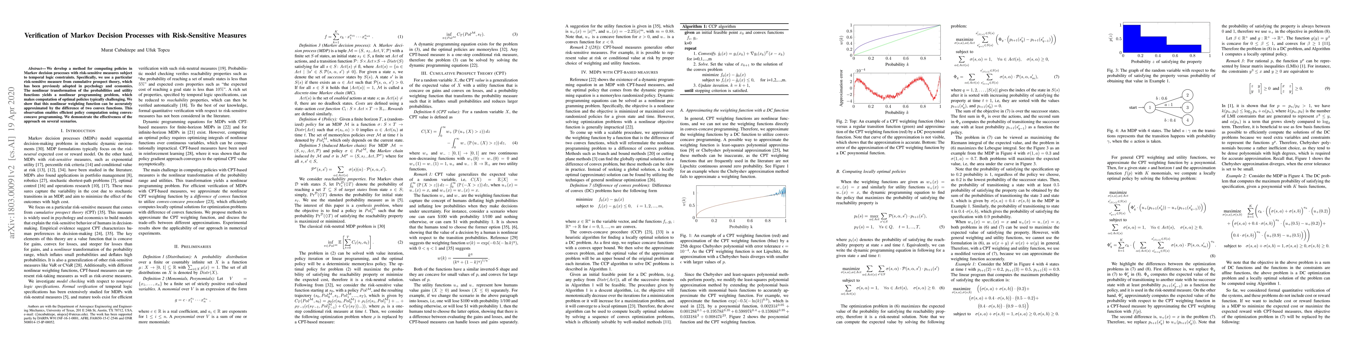 This paper proposes a method for computing optimal policies in Markov decision processes with risk-sensitive measures, using a nonlinear transformation from cumulative prospect theory. The authors approximate the nonlinear weighting function with the difference of two convex functions, enabling efficient convex-concave programming for policy computation and demonstrating effectiveness across various scenarios.