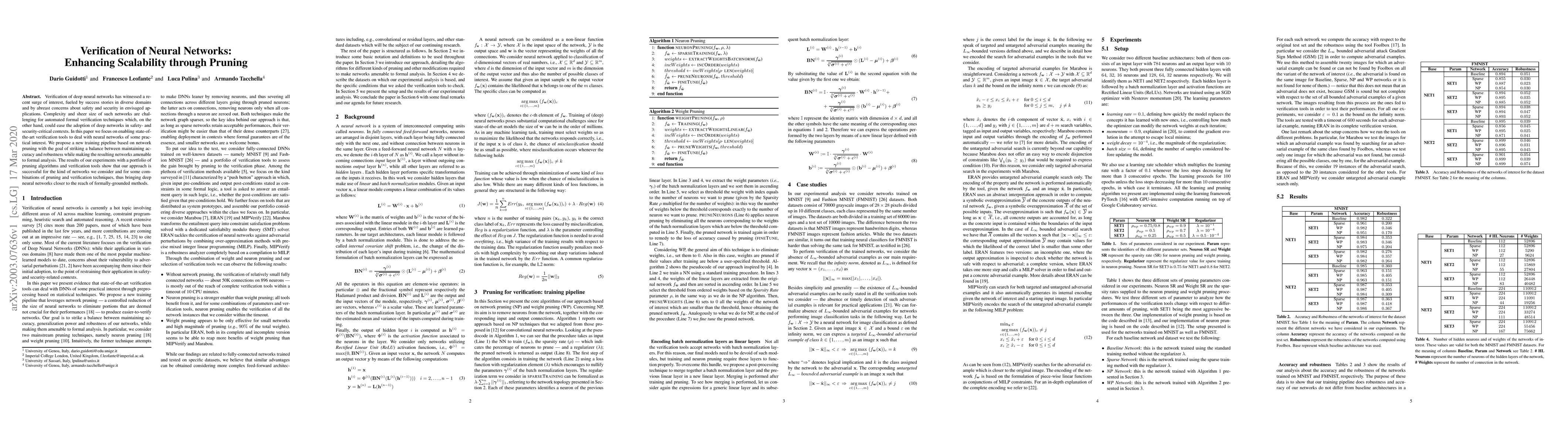 Verification of deep neural networks has witnessed a recent surge of interest, fueled by success stories in diverse domains and by abreast concerns about safety and security in envisaged applications. Complexity and sheer size of such networks are challenging for automated formal verification techniques which, on the other hand, could ease the adoption of deep networks in safety- and security-critical contexts. In this paper we focus on enabling state-of-the-art verification tools to deal with neural networks of some practical interest. We propose a new training pipeline based on network pruning with the goal of striking a balance between maintaining accuracy and robustness while making the resulting networks amenable to formal analysis. The results of our experiments with a portfolio of pruning algorithms and verification tools show that our approach is successful for the kind of networks we consider and for some combinations of pruning and verification techniques, thus bringing deep neural networks closer to the reach of formally-grounded methods.