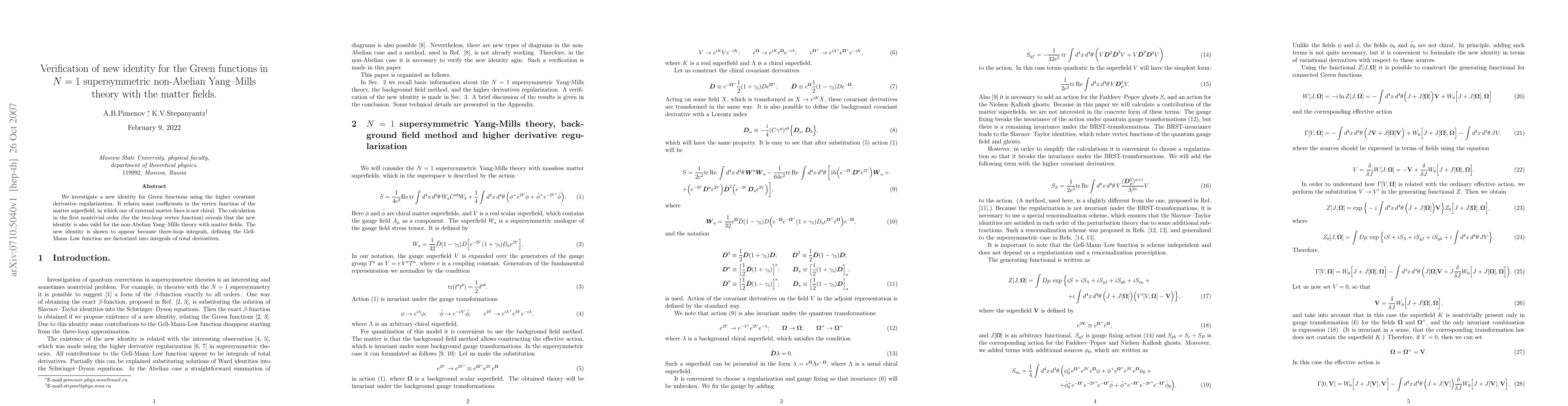This paper verifies a new identity for Green functions in N=1 supersymmetric non-Abelian Yang-Mills theory using higher covariant derivative regularization. The identity relates coefficients in the vertex function involving a non-chiral external matter line, and it holds for the two-loop vertex function, demonstrating factorization of three-loop integrals into total derivatives.