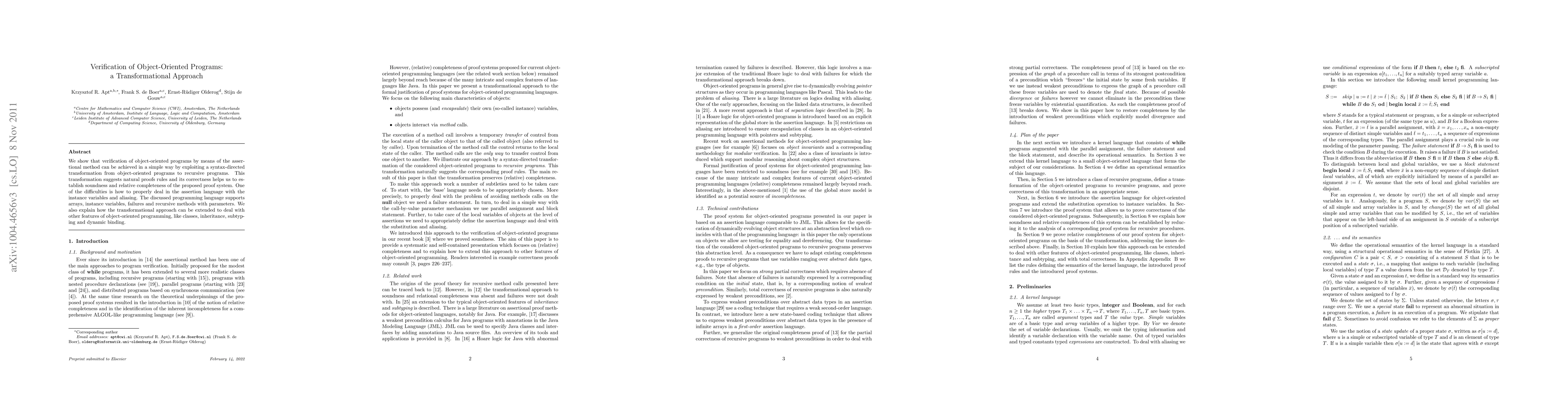 This paper proposes a transformational approach to verify object-oriented programs using assertional methods, transforming them into recursive programs for easier verification. The transformation aids in establishing the soundness and relative completeness of the proof system, addressing challenges related to instance variables and aliasing.