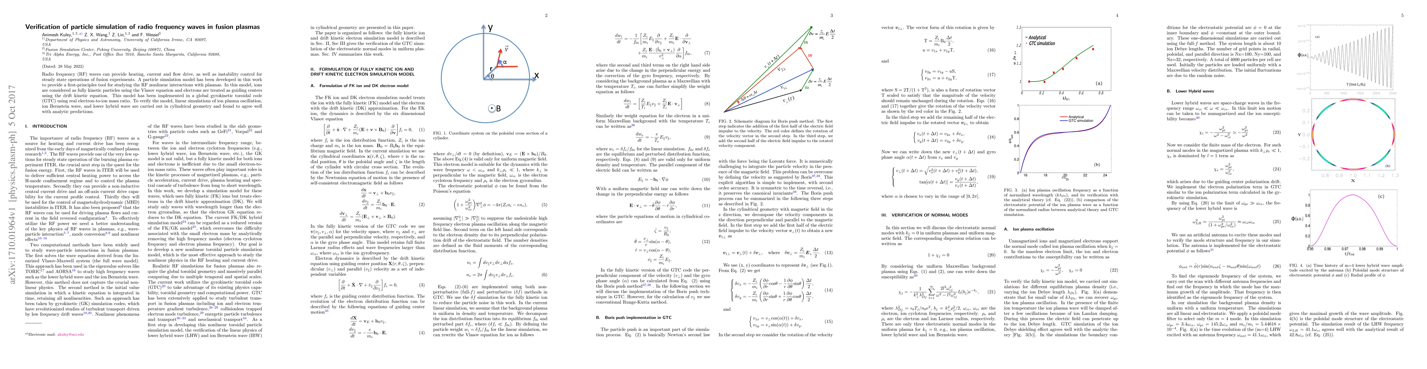 Radio frequency (RF) waves can provide heating, current and flow drive, as well as instability control for steady state operations of fusion experiments. A particle simulation model has been developed in this work to provide a first-principles tool for studying the RF nonlinear interactions with plasmas. In this model, ions are considered as fully kinetic particles using the Vlasov equation and electrons are treated as guiding centers using the drift kinetic equation. This model has been implemented in a global gyrokinetic toroidal code (GTC) using real electron-to-ion mass ratio. To verify the model, linear simulations of ion plasma oscillation, ion Bernstein wave, and lower hybrid wave are carried out in cylindrical geometry and found to agree well with analytic predictions.