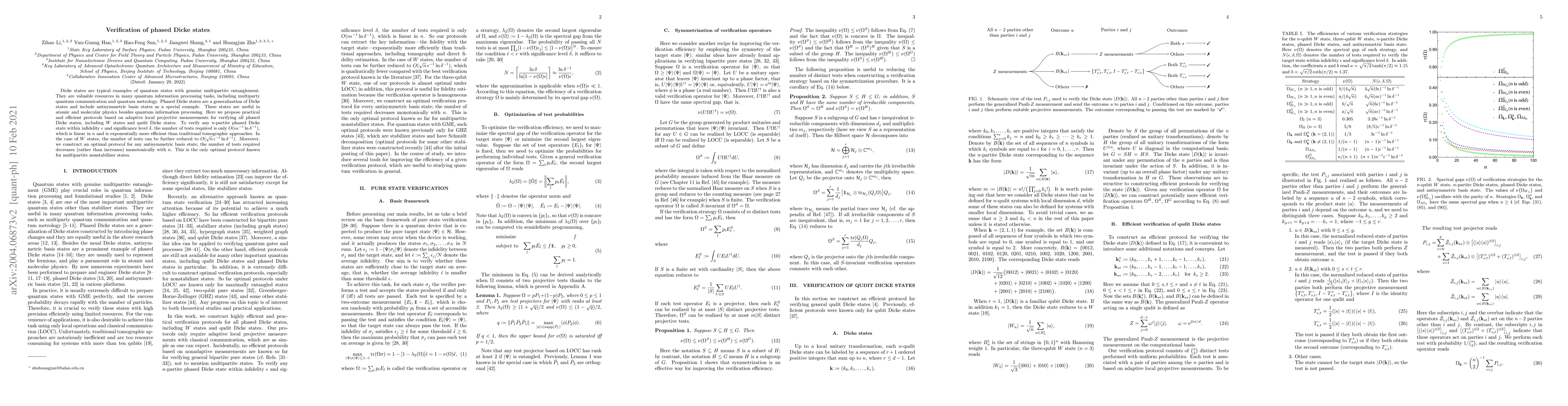 This paper proposes efficient protocols for verifying phased Dicke states using adaptive local projective measurements, showing linear scalability with the number of parties and significant efficiency improvements over traditional tomography. The protocols are optimal for $W$ states and antisymmetric basis states, requiring fewer tests as the number of parties increases.