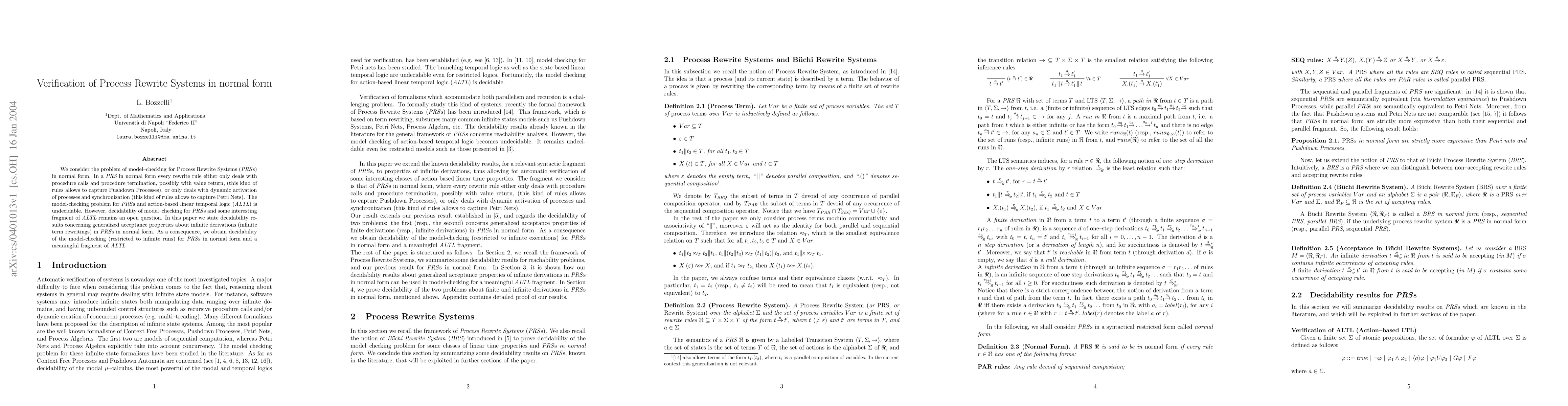 This paper investigates the decidability of model-checking for Process Rewrite Systems (PRSs) in normal form, focusing on generalized acceptance properties for infinite derivations. It establishes decidability for model-checking restricted to infinite runs and a meaningful fragment of action-based linear temporal logic (ALTL).