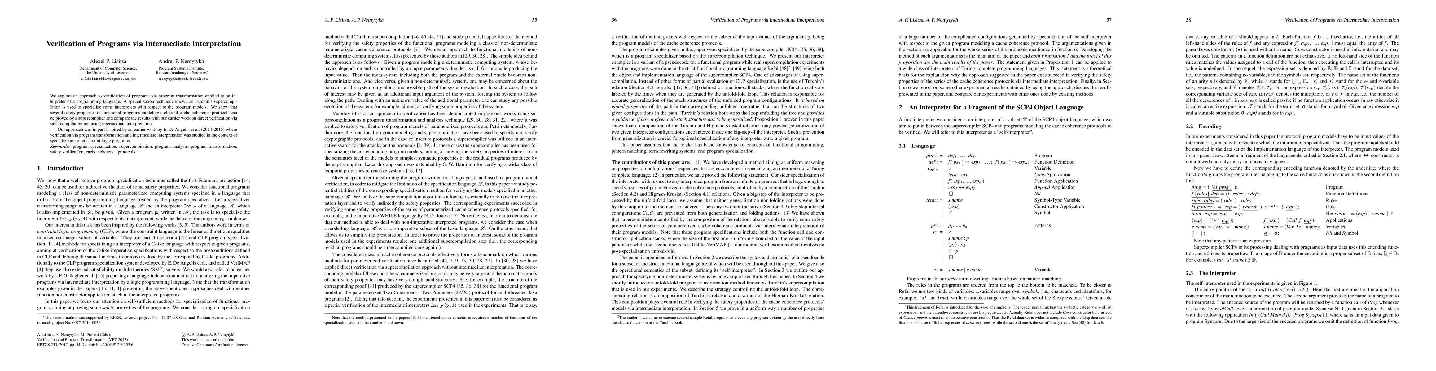 This paper investigates an approach to program verification using intermediate interpretation and Turchin's supercompilation technique to specialize interpreters. The authors demonstrate that safety properties of functional programs modeling cache coherence protocols can be verified through this method, comparing it with their prior work on direct verification without intermediate interpretation.