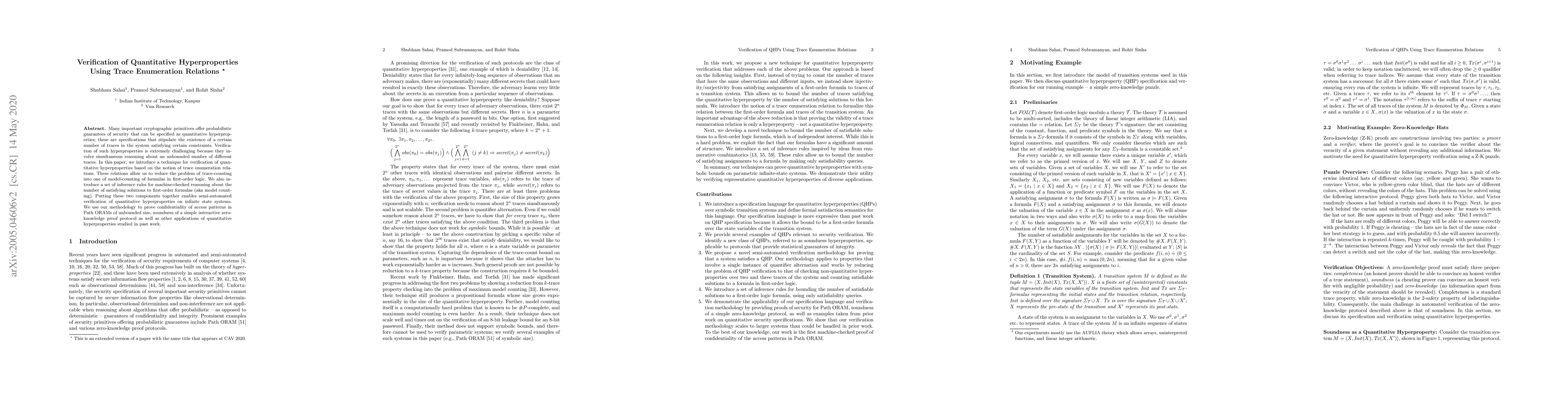 This paper presents a technique for verifying quantitative hyperproperties through trace enumeration relations, reducing trace-counting to model-counting in first-order logic. It introduces inference rules for machine-checked reasoning about model counts, enabling semi-automated verification of infinite state systems, demonstrated through proofs of confidentiality and soundness in cryptographic protocols.