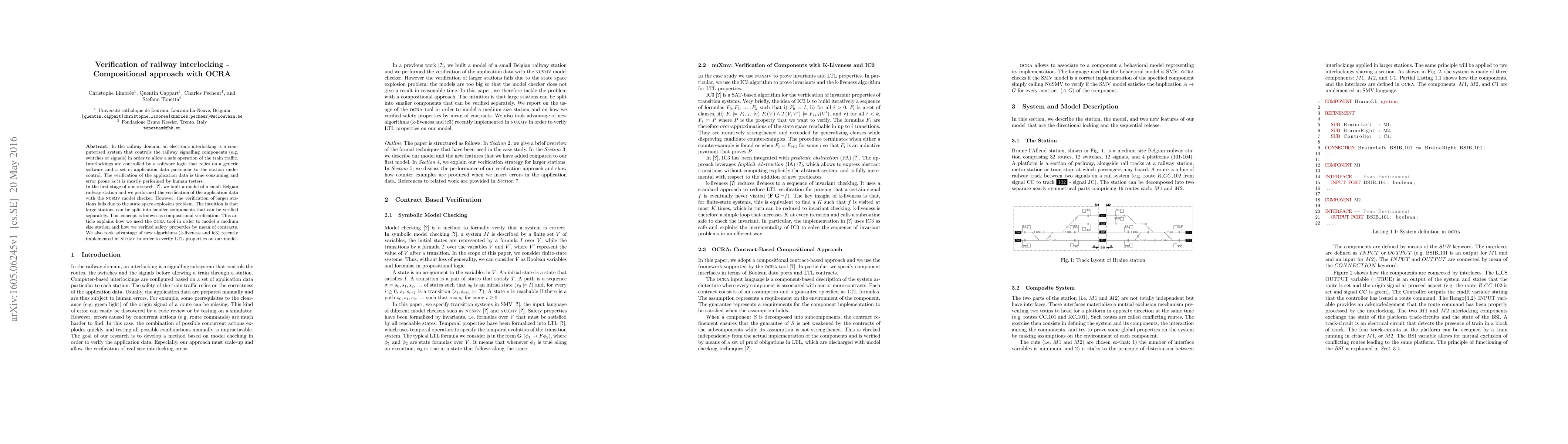 This paper explores compositional verification of railway interlocking systems using the OCRA tool, addressing the state space explosion problem by splitting large stations into smaller components. The authors demonstrate verification of safety properties through contracts and utilize new algorithms in NuSMV for LTL property verification.