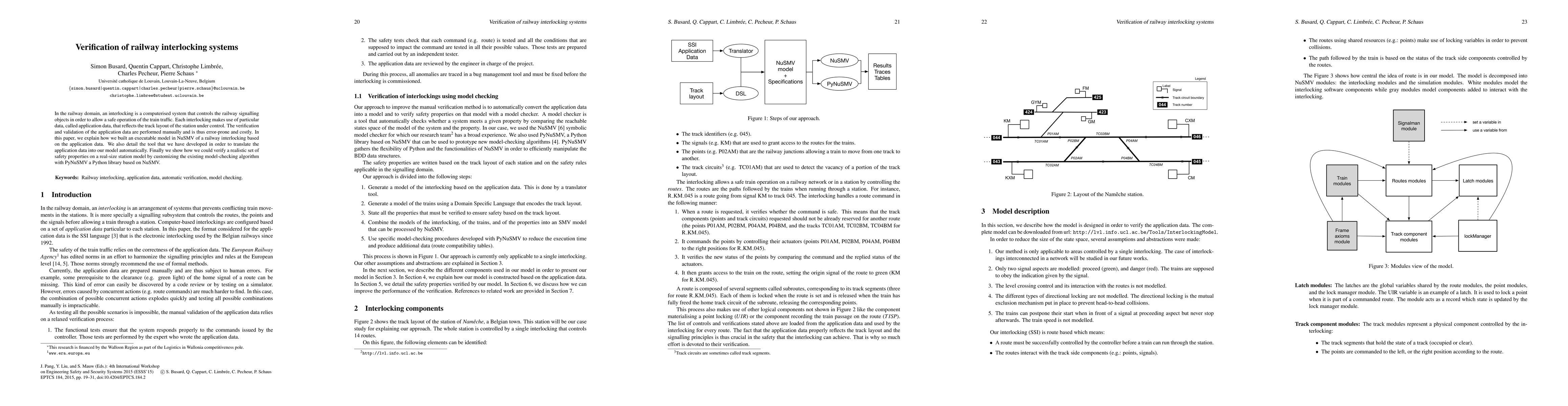 This paper presents a method for automating the verification of railway interlocking systems using an executable model in NuSMV, along with a tool for automatic translation of application data into the model. The authors demonstrate the effectiveness of their approach by verifying safety properties on a real-size station model.