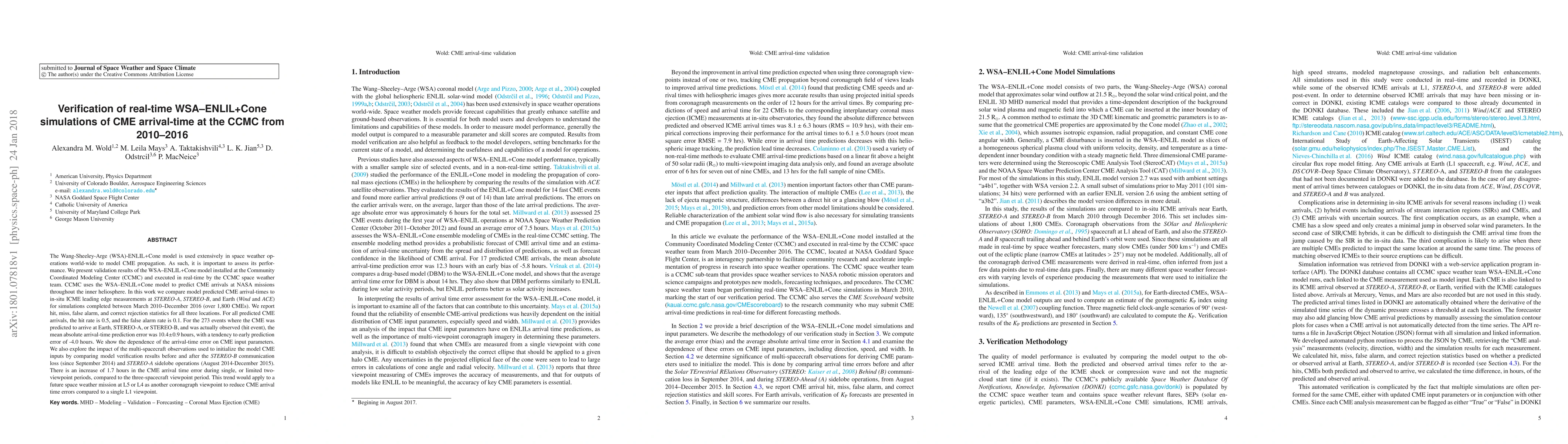 The WSA-ENLIL+Cone model was validated for predicting CME arrival times at NASA missions with a hit rate of 50% and an average error of 10.4 hours, suggesting improvements could be made by using multiple viewpoints or reducing the number of single-viewpoint periods.