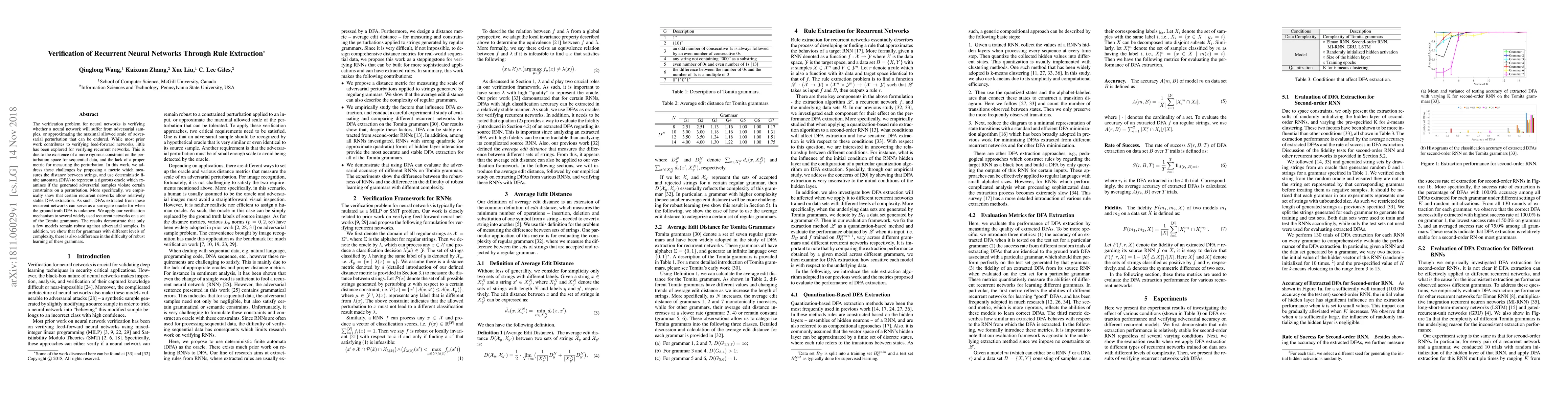This paper proposes a novel metric and method for verifying recurrent neural networks against adversarial samples, using deterministic finite automata (DFA) to extract rules from stable networks. The study finds that only a few recurrent networks remain robust, and highlights varying difficulties in learning robust models for grammars with different complexities.