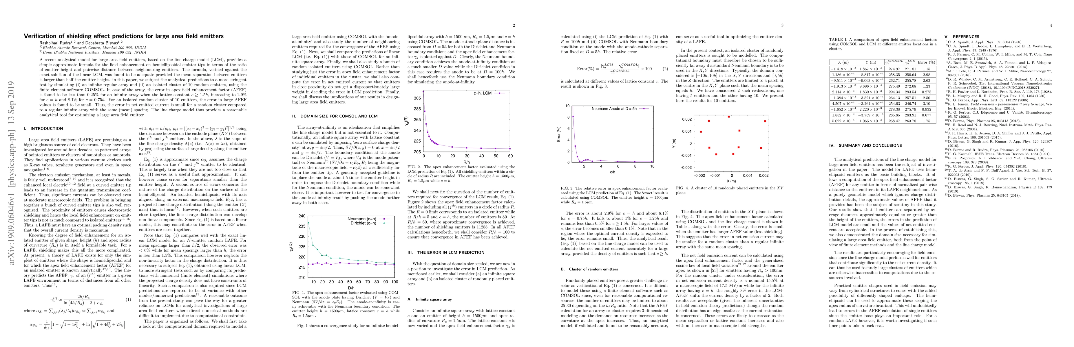 This paper verifies an analytical model for large area field emitters using COMSOL simulations, showing that the model's predictions are accurate for regular arrays when the lattice constant is greater than or equal to 1.5 times the emitter height, with errors less than 0.25%. For isolated clusters, the error remains small, indicating the model's utility for optimizing field emitters.