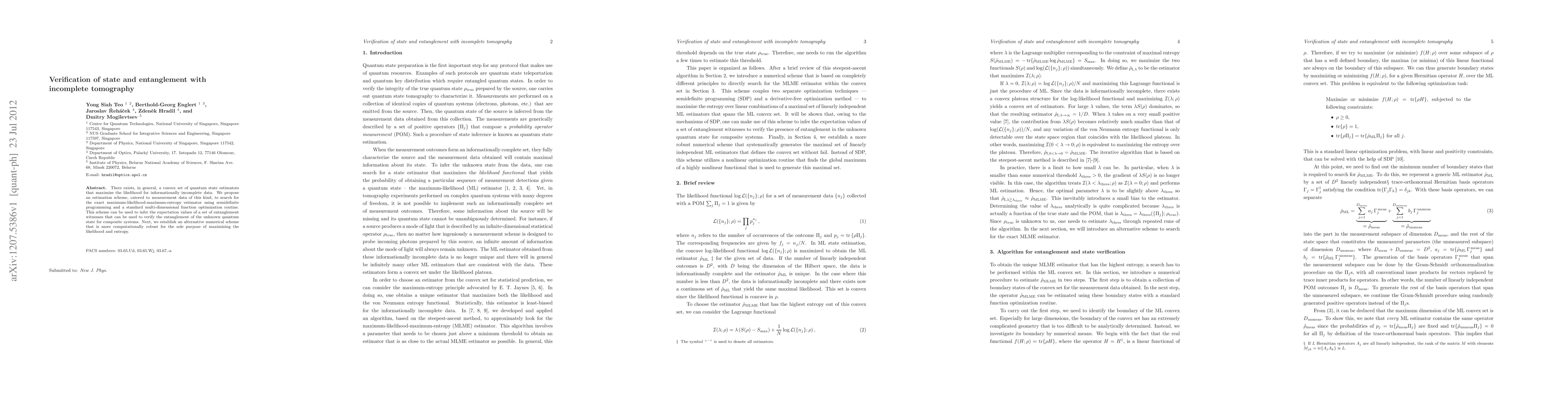 The paper proposes an estimation scheme for quantum state and entanglement verification using incomplete tomography data. It employs semidefinite programming and a multi-dimensional optimization routine to find the maximum-likelihood-maximum-entropy (MLME) estimator. An alternative numerical scheme is also introduced for more computational robustness in maximizing likelihood and entropy.