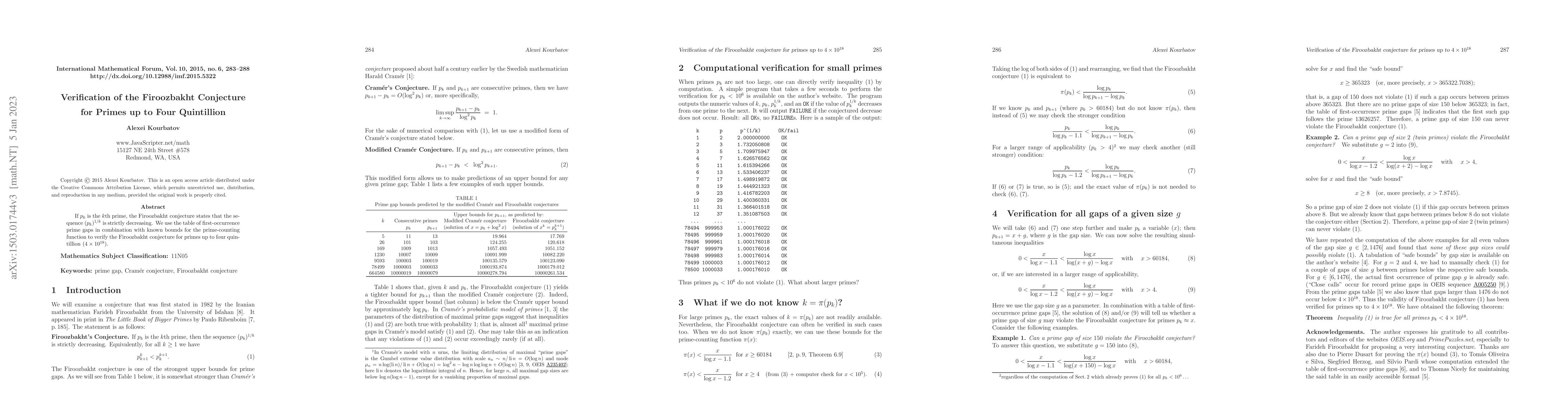 This paper verifies the Firoozbakht conjecture, which posits that the sequence $(p_k)^{1/k}$ is strictly decreasing for primes $p_k$, for all primes up to four quintillion $(4\times10^{18})$ by leveraging prime gap data and prime-counting function bounds.