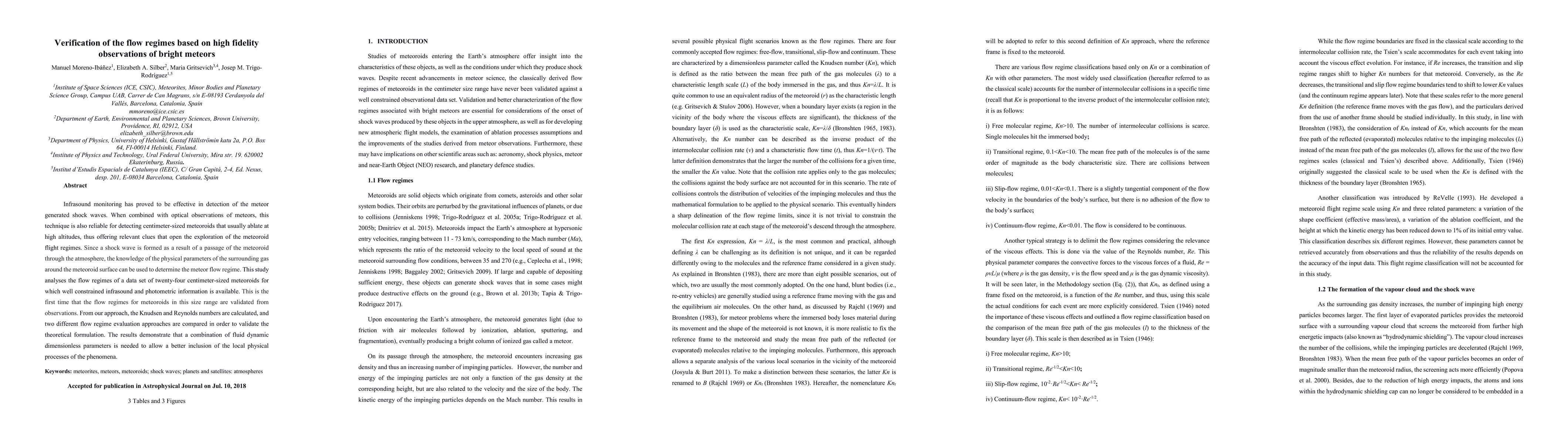 Infrasound monitoring has proved to be effective in detection of the meteor generated shock waves. When combined with optical observations of meteors, this technique is also reliable for detecting centimeter-sized meteoroids that usually ablate at high altitudes, thus offering relevant clues that open the exploration of the meteoroid flight regimes. Since a shock wave is formed as a result of a passage of the meteoroid through the atmosphere, the knowledge of the physical parameters of the surrounding gas around the meteoroid surface can be used to determine the meteor flow regime. This study analyses the flow regimes of a data set of twenty-four centimeter-sized meteoroids for which well constrained infrasound and photometric information is available. This is the first time that the flow regimes for meteoroids in this size range are validated from observations. From our approach, the Knudsen and Reynolds numbers are calculated, and two different flow regime evaluation approaches are compared in order to validate the theoretical formulation. The results demonstrate that a combination of fluid dynamic dimensionless parameters is needed to allow a better inclusion of the local physical processes of the phenomena.