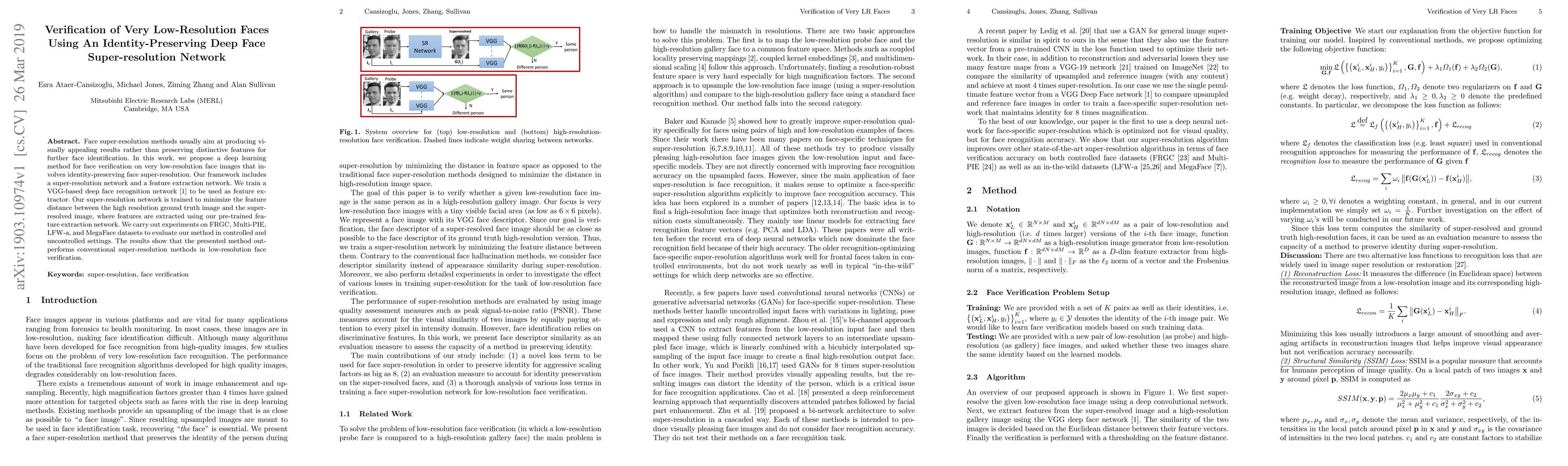 This paper proposes a deep learning method for verifying identities in very low-resolution face images through an identity-preserving super-resolution network. The method combines a super-resolution network with a VGG-based feature extractor to minimize feature distance, achieving better performance than conventional methods in face verification tasks.
