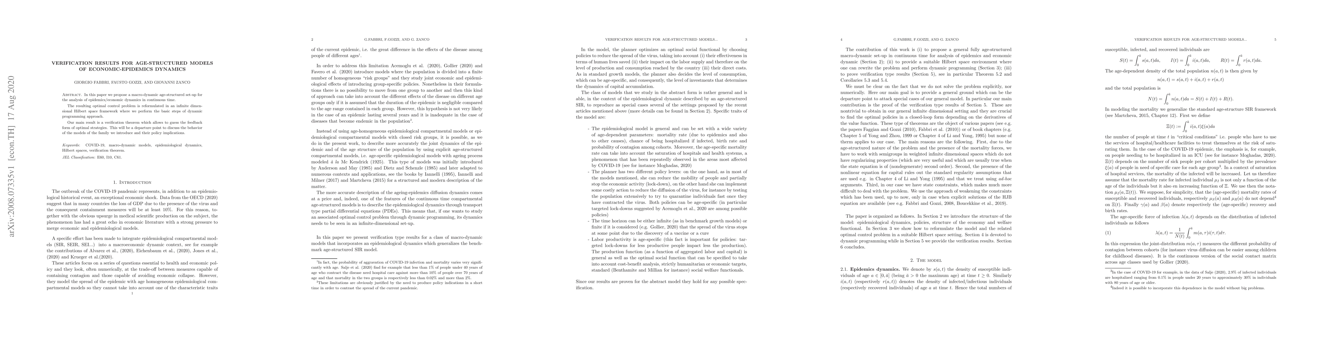 In this paper we propose a macro-dynamic age-structured set-up for the analysis of epidemics/economic dynamics in continuous time. The resulting optimal control problem is reformulated in an infinite dimensional Hilbert space framework where we perform the basic steps of dynamic programming approach. Our main result is a verification theorem which allows to guess the feedback form of optimal strategies. This will be a departure point to discuss the behavior of the models of the family we introduce and their policy implications.