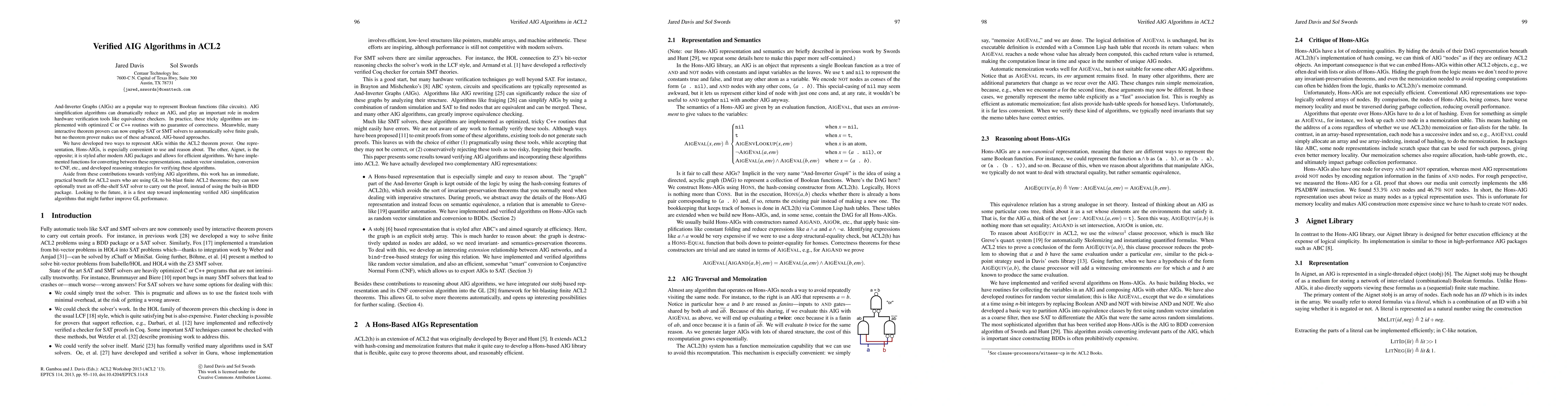 This paper presents two representations of And-Inverter Graphs (AIGs) within the ACL2 theorem prover, aiming to verify AIG simplification algorithms. The Hons-AIGs representation is user-friendly, while Aignet mimics modern AIG packages for efficiency. The work also includes conversion functions, simulation, and verification strategies, potentially enhancing the performance of ACL2's GL bit-blaster by leveraging SAT solvers.