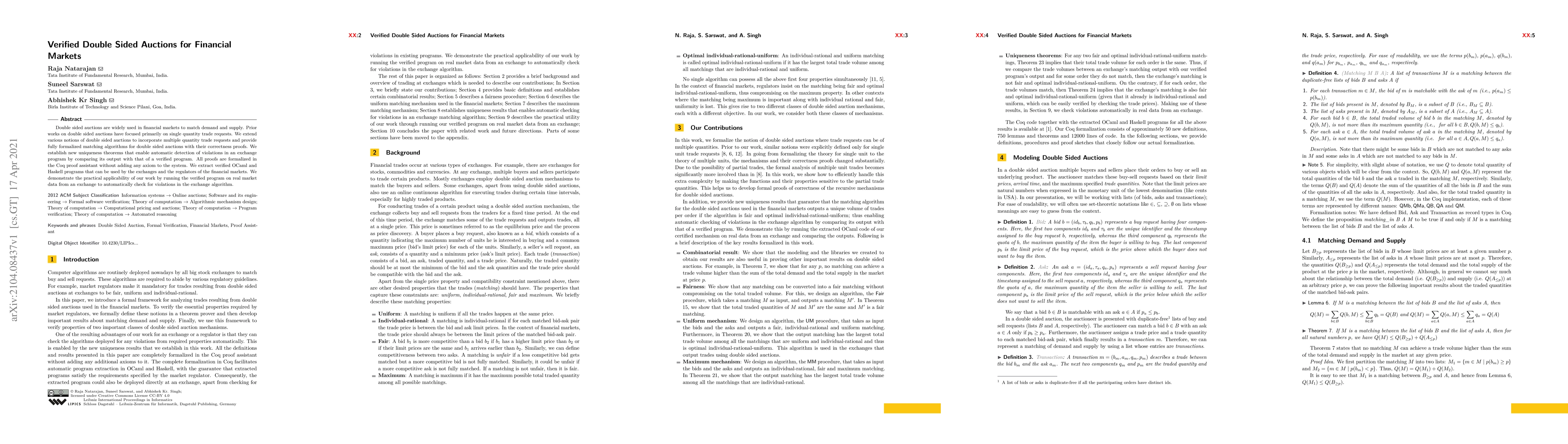 This paper extends double sided auctions for financial markets to handle multiple quantity trade requests, providing formalized matching algorithms with correctness proofs in Coq. It also introduces uniqueness theorems for automatic violation detection and extracts verified OCaml and Haskell programs, demonstrating practical application on real market data.