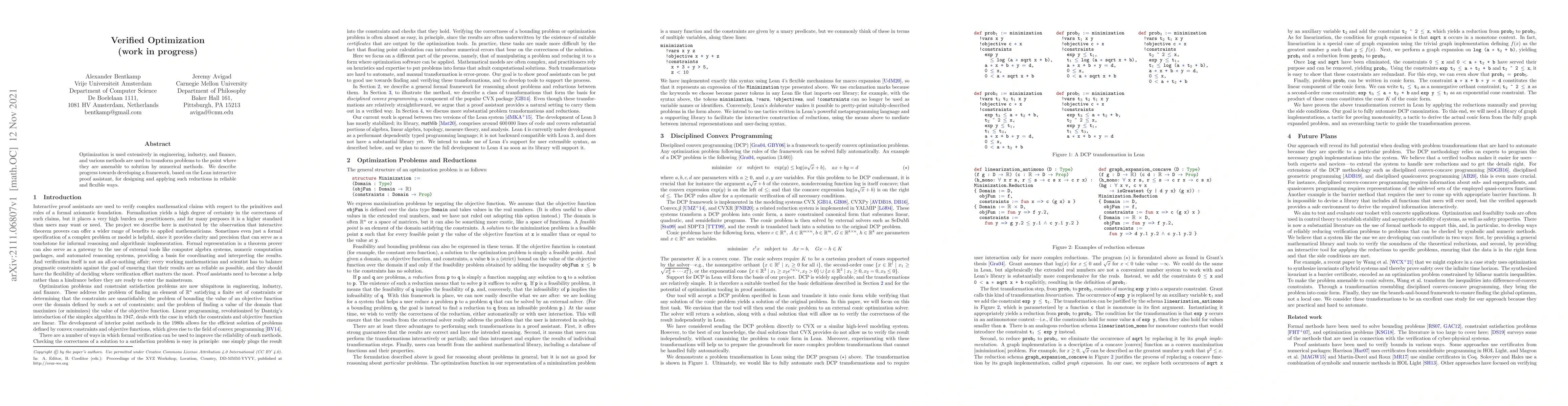 Summary: This paper discusses advancements in creating a reliable and adaptable optimization framework using the Lean interactive proof assistant, aiming to transform complex problems into solvable forms through verified optimization techniques.