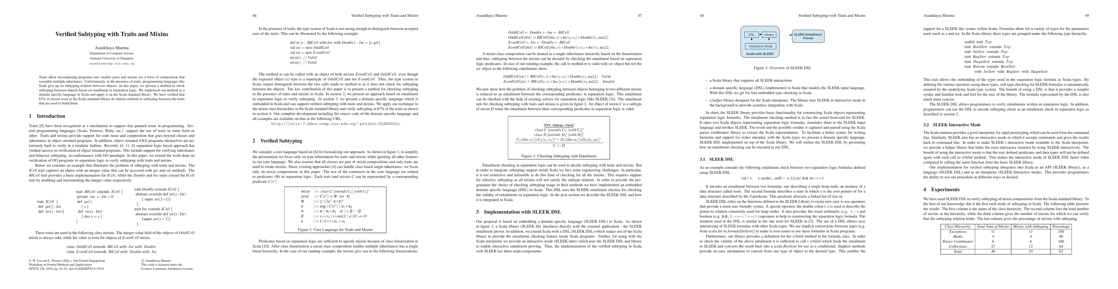 This paper proposes a method for verifying subtyping in Scala using traits and mixins through entailment in separation logic. The authors implement their method in Scala and find that 67% of mixins in the Scala standard library conform to subtyping with their traits.