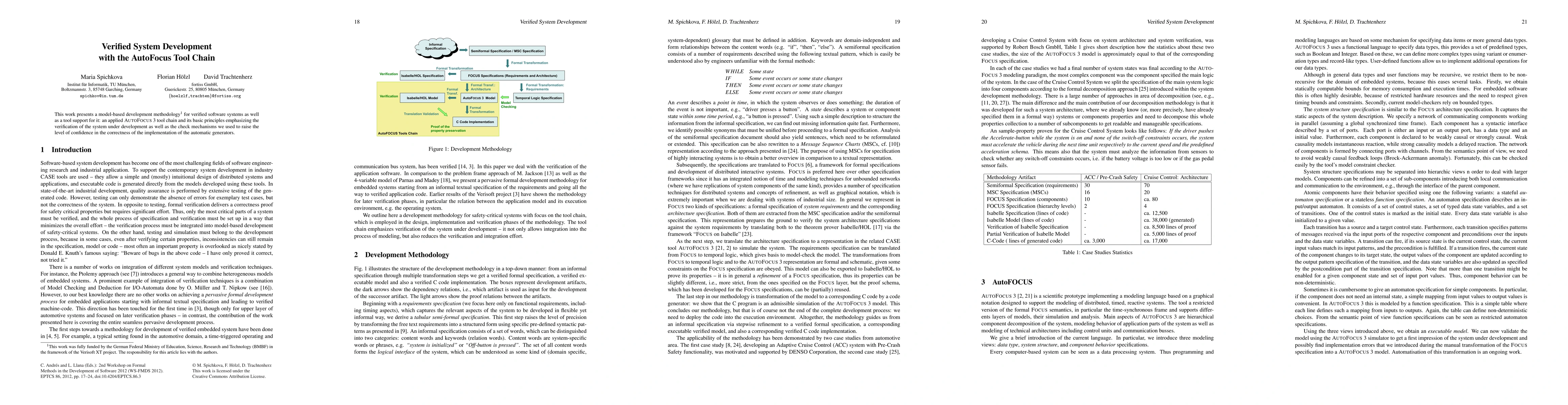 This work presents a model-based development methodology for verified software systems as well as a tool support for it: an applied AutoFocus tool chain and its basic principles emphasizing the verification of the system under development as well as the check mechanisms we used to raise the level of confidence in the correctness of the implementation of the automatic generators.
