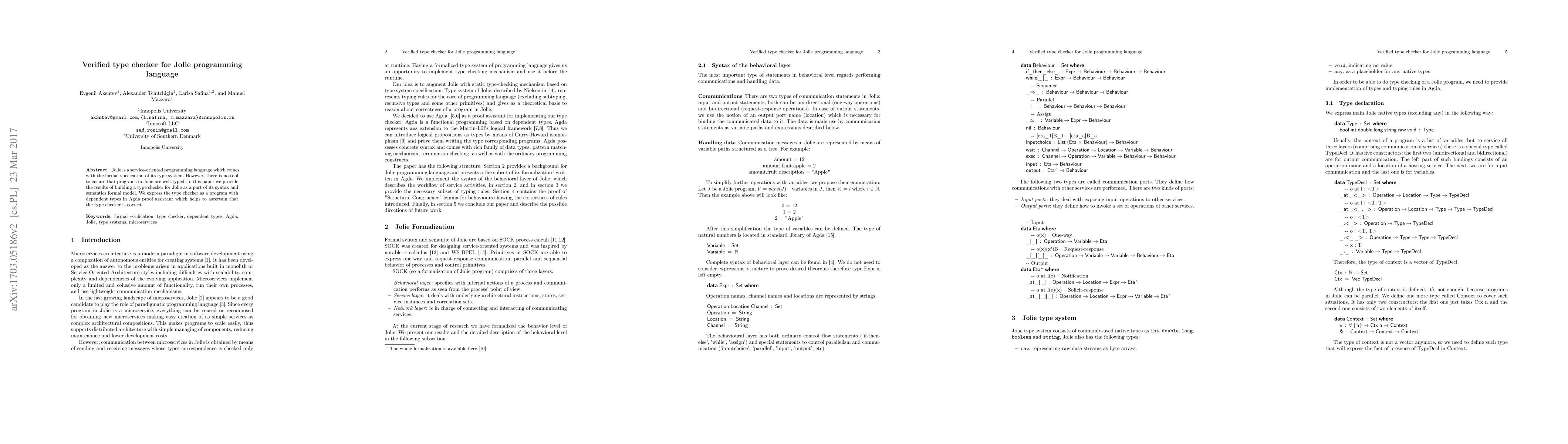 This work is novel as it applies dependent types in Agda to express Jolie types and typing rules, providing a verified type checker for a service-oriented programming language, which is currently dynamically type-checked.