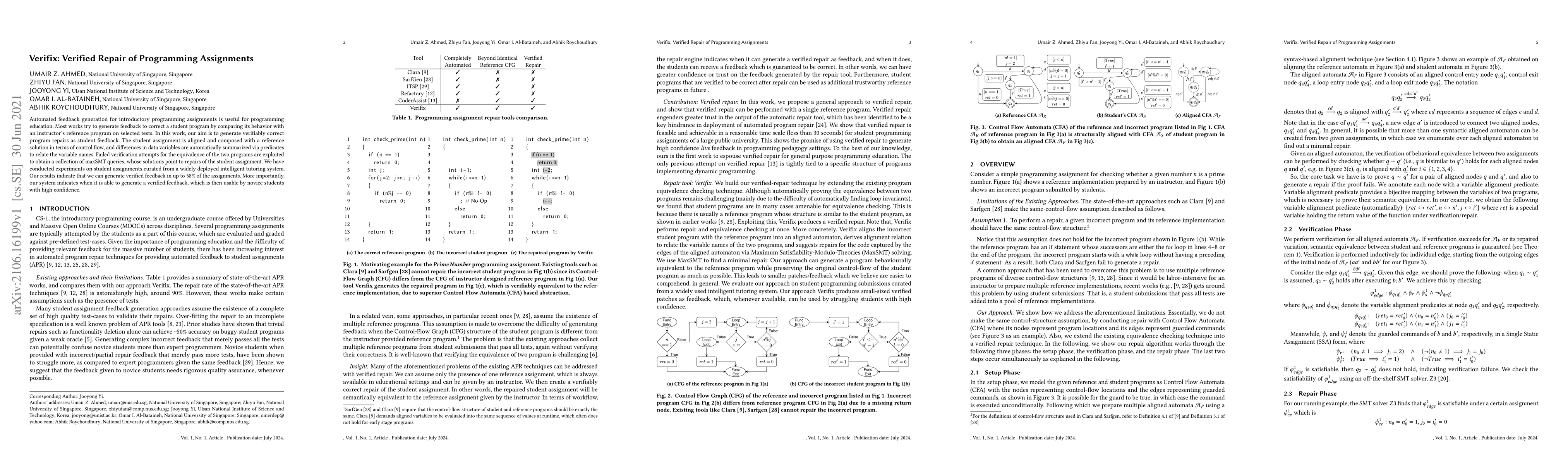 Title: Verifix: Verified Repair of Programming Assignments Summary: This paper presents an automated system for generating verifiably correct repairs for student programming assignments by aligning and comparing them with reference solutions, and using SMT queries to identify and correct errors, achieving verified feedback for up to 58% of assignments.