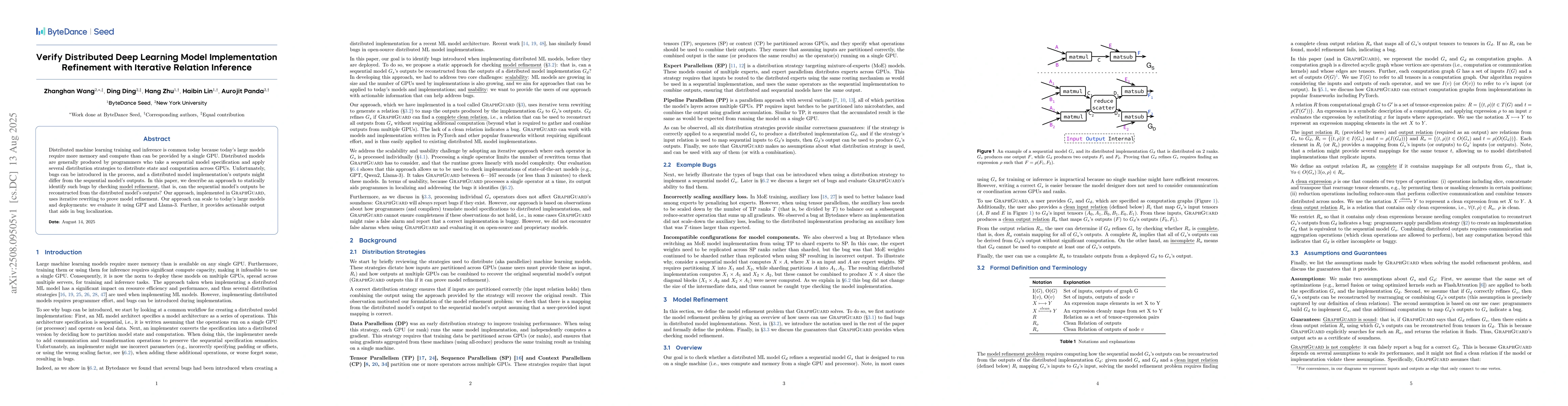 Distributed machine learning training and inference is common today because today's large models require more memory and compute than can be provided by a single GPU. Distributed models are generally produced by programmers who take a sequential model specification and apply several distribution strategies to distribute state and computation across GPUs. Unfortunately, bugs can be introduced in the process, and a distributed model implementation's outputs might differ from the sequential model's outputs. In this paper, we describe an approach to statically identify such bugs by checking model refinement, that is, can the sequential model's outputs be reconstructed from the distributed model's outputs? Our approach, implemented in GraphGuard, uses iterative rewriting to prove model refinement. Our approach can scale to today's large models and deployments: we evaluate it using GPT and Llama-3. Further, it provides actionable output that aids in bug localization.