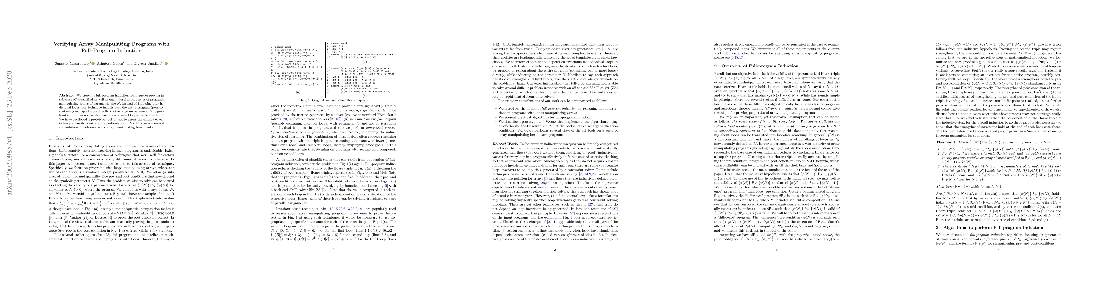 This paper introduces a full-program induction method for verifying properties of array-manipulating programs, inducting directly over the entire program using the program parameter, without loop-specific invariants. A prototype tool, Vajra, was developed to test this technique, showing competitive performance compared to other state-of-the-art verification tools.
