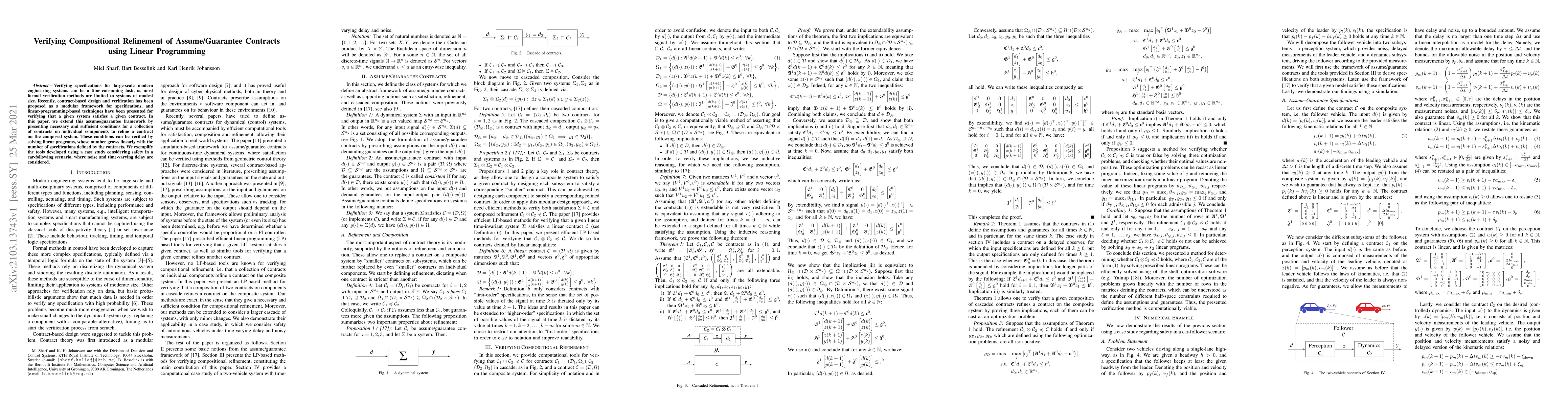 This paper proposes linear-programming-based conditions for verifying compositional refinement of assume/guarantee contracts in modular systems, with the number of linear programs growing linearly with the number of contracts. A case study on car-following safety illustrates the practical application of the developed tools.