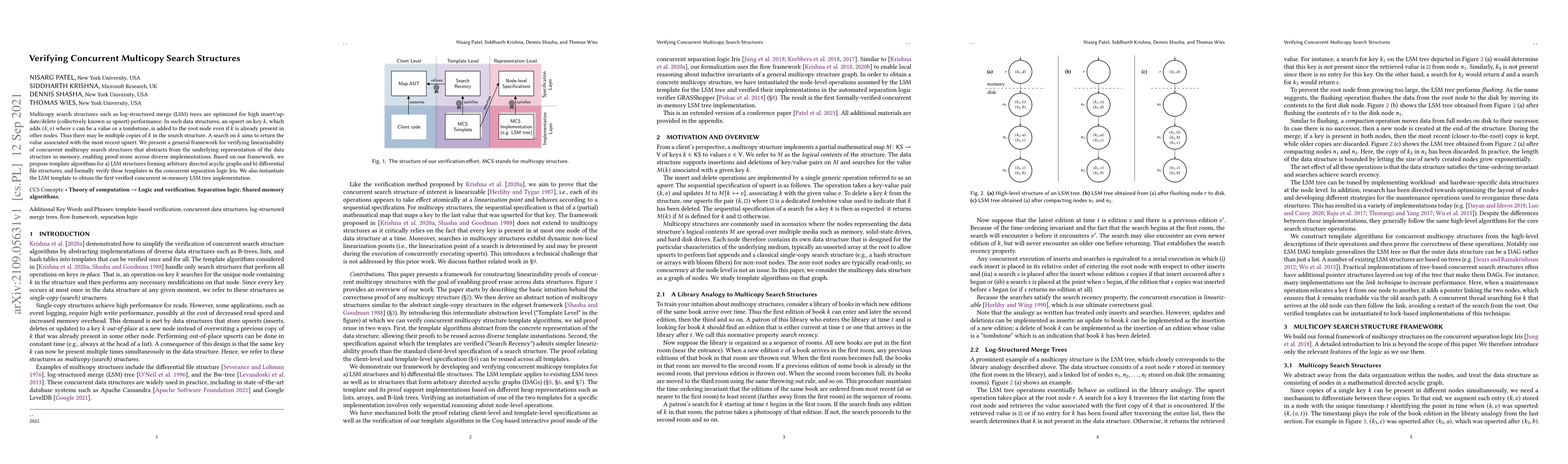 This paper presents a framework for verifying the linearizability of concurrent multicopy search structures like LSM trees, enabling proof-reuse across different implementations. The authors propose template algorithms for LSM structures and differential file structures and provide the first verified concurrent in-memory LSM tree implementation.