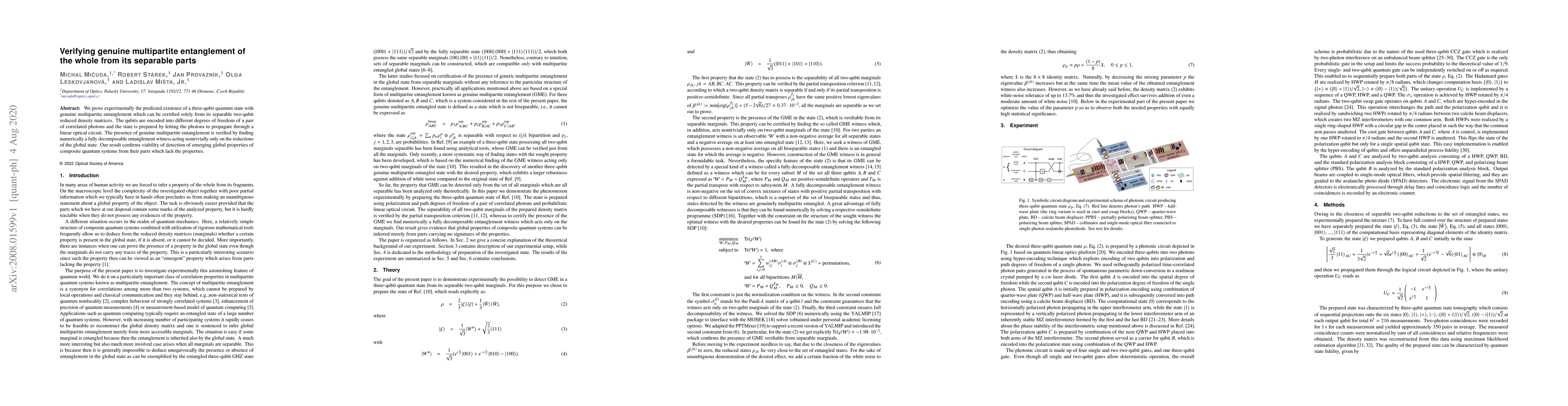 This research experimentally confirms the existence of a three-qubit quantum state with genuine multipartite entanglement, verifiable only through its separable two-qubit reduced density matrices. The qubits are embedded in correlated photons, with the state prepared via a linear optical circuit. The study demonstrates the detection of global quantum properties from local system parts, validating the viability of such an approach.
