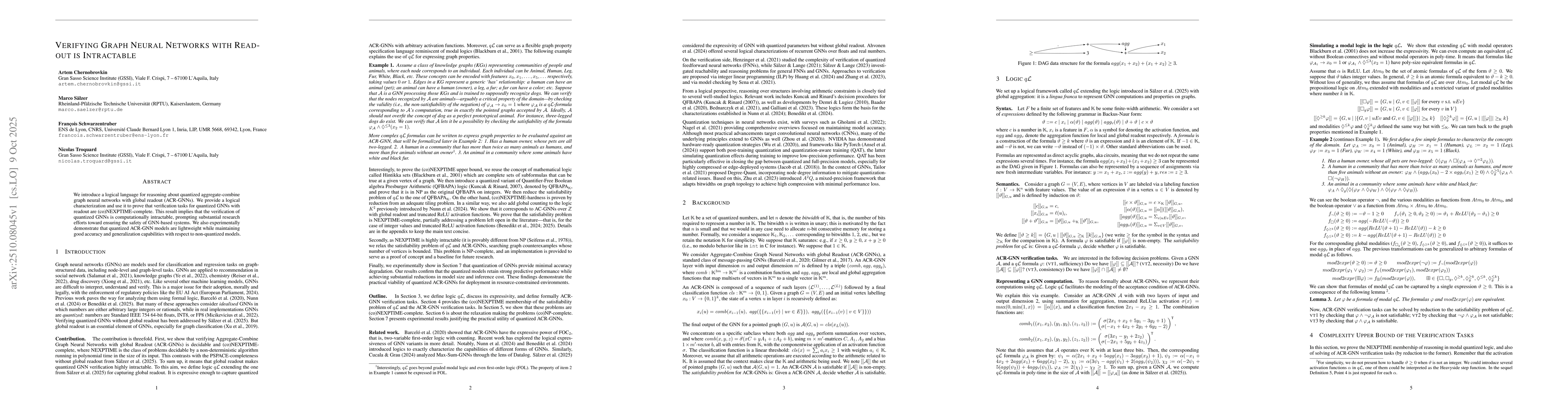 We introduce a logical language for reasoning about quantized aggregate-combine graph neural networks with global readout (ACR-GNNs). We provide a logical characterization and use it to prove that verification tasks for quantized GNNs with readout are (co)NEXPTIME-complete. This result implies that the verification of quantized GNNs is computationally intractable, prompting substantial research efforts toward ensuring the safety of GNN-based systems. We also experimentally demonstrate that quantized ACR-GNN models are lightweight while maintaining good accuracy and generalization capabilities with respect to non-quantized models.