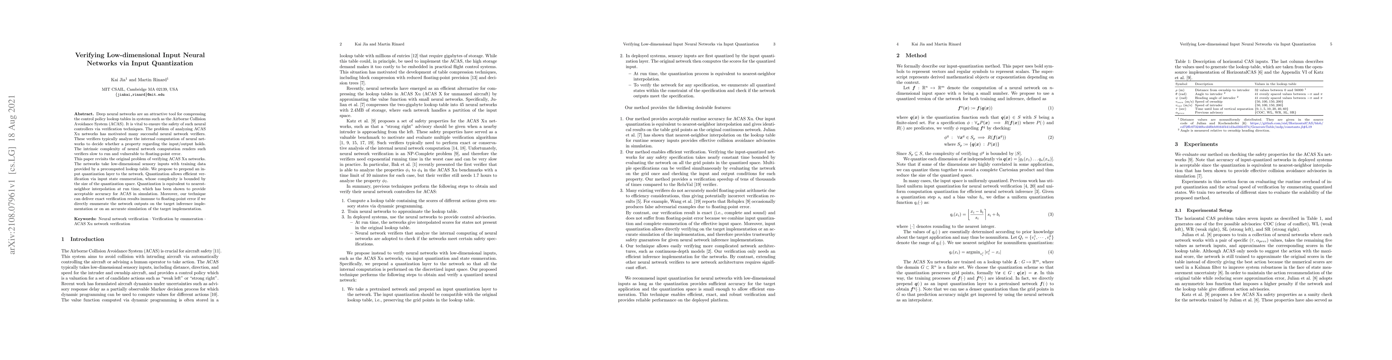 This paper proposes a method to verify low-dimensional input neural networks by prepending an input quantization layer, enabling efficient verification via input state enumeration. This approach provides exact verification results immune to floating-point error and maintains acceptable accuracy for applications like the Airborne Collision Avoidance System (ACAS).