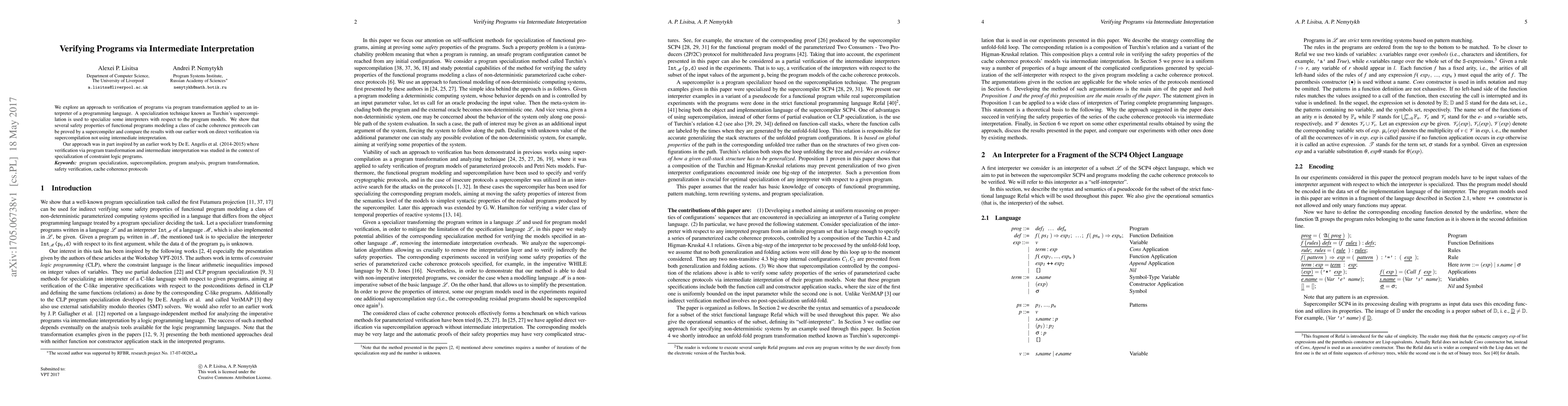 This paper investigates verifying programs through program transformation and intermediate interpretation, employing Turchin's supercompilation to specialize interpreters. The authors demonstrate that safety properties of functional programs modeling cache coherence protocols can be proven using this method, comparing results with previous direct verification techniques.