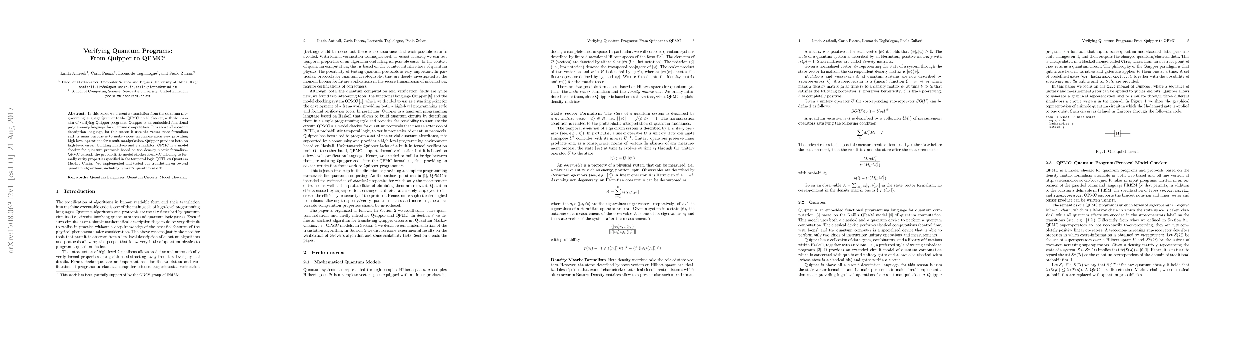 The paper presents a translation from the quantum programming language Quipper to the QPMC model checker, focusing on verifying Quipper programs using the density matrix formalism of QPMC, which extends IscasMC for temporal logic QCTL on Quantum Markov Chains.