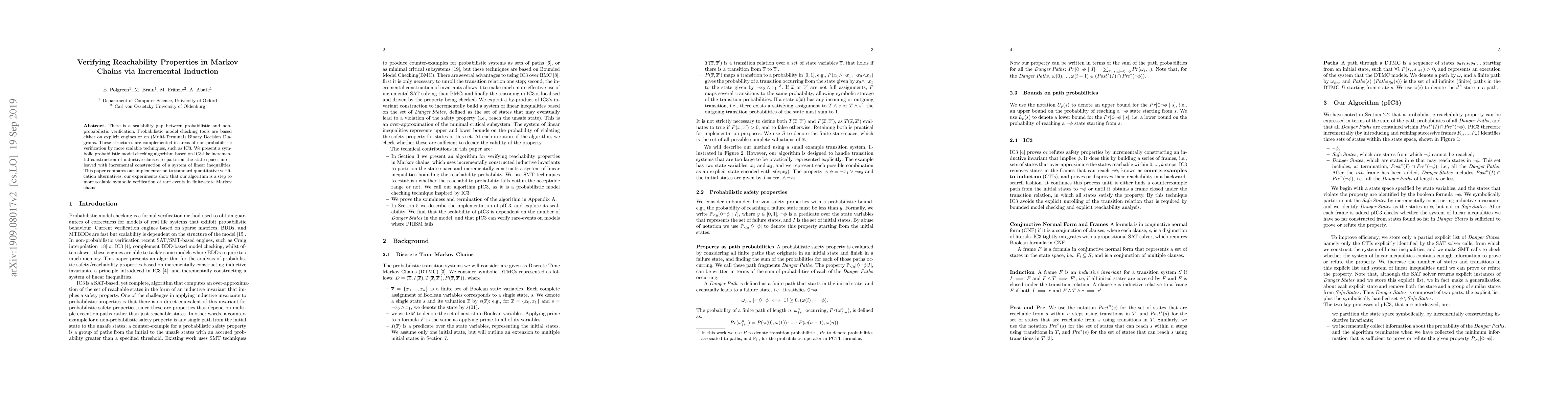 There is a scalability gap between probabilistic and non-probabilistic verification. Probabilistic model checking tools are based either on explicit engines or on (Multi-Terminal) Binary Decision Diagrams. These structures are complemented in areas of non-probabilistic verification by more scalable techniques, such as IC3. We present a symbolic probabilistic model checking algorithm based on IC3-like incremental construction of inductive clauses to partition the state space, interleaved with incremental construction of a system of linear inequalities. This paper compares our implementation to standard quantitative verification alternatives: our experiments show that our algorithm is a step to more scalable symbolic verification of rare events in finite-state Markov chains.