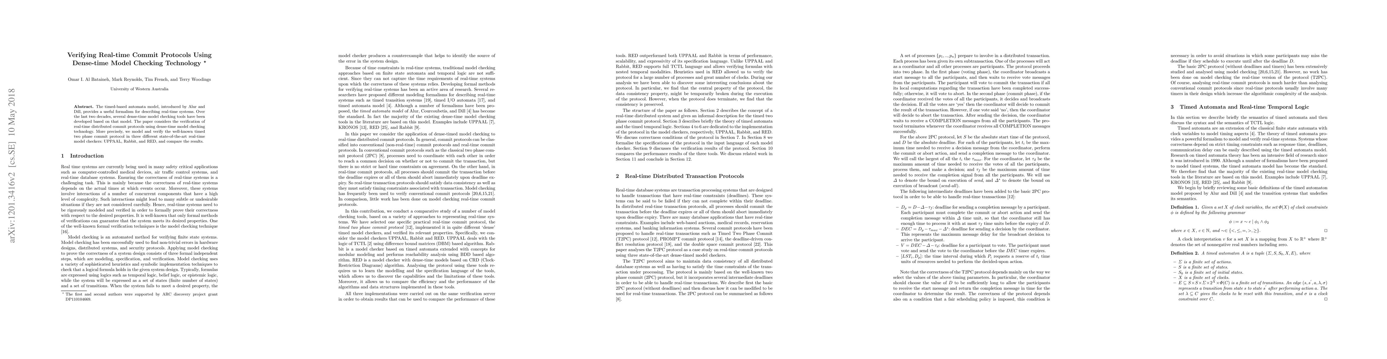 This paper employs dense-time model checking to verify real-time distributed commit protocols, specifically the timed two-phase commit protocol, using UPPAAL, Rabbit, and RED model checkers to compare their verification results.