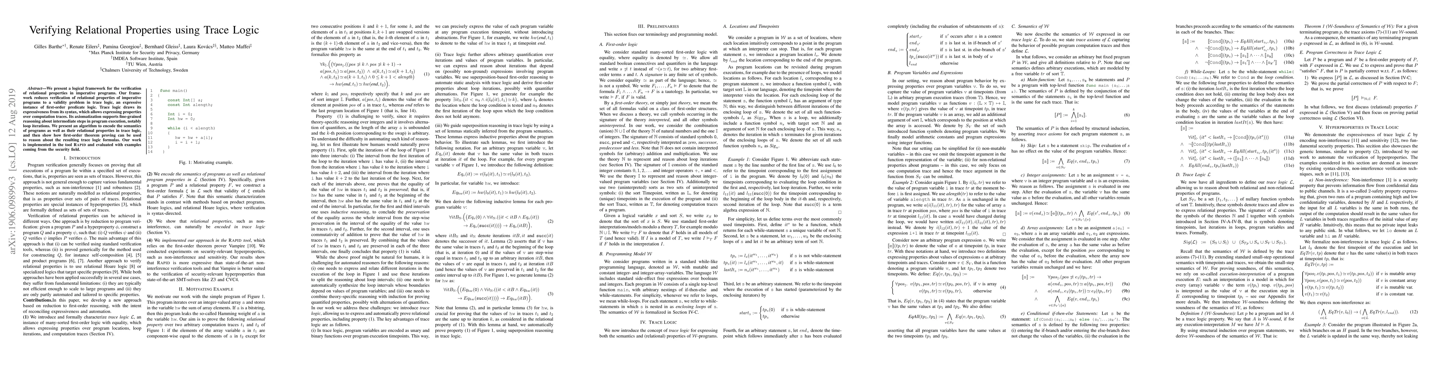 This paper introduces a logical framework for verifying relational properties in imperative programs by translating them into trace logic, an expressive first-order predicate logic. The authors present an algorithm to encode program semantics and properties, demonstrating its use in first-order theorem proving and validating it with security-related examples in the tool Rapid.