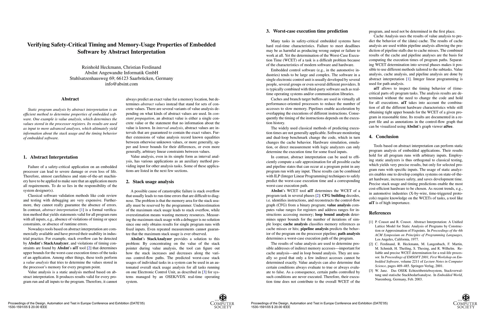 This paper explores the use of abstract interpretation for statically verifying safety-critical timing and memory-usage properties in embedded software. It employs value analysis to determine register values, which informs further analyses to assess stack usage and timing behavior.