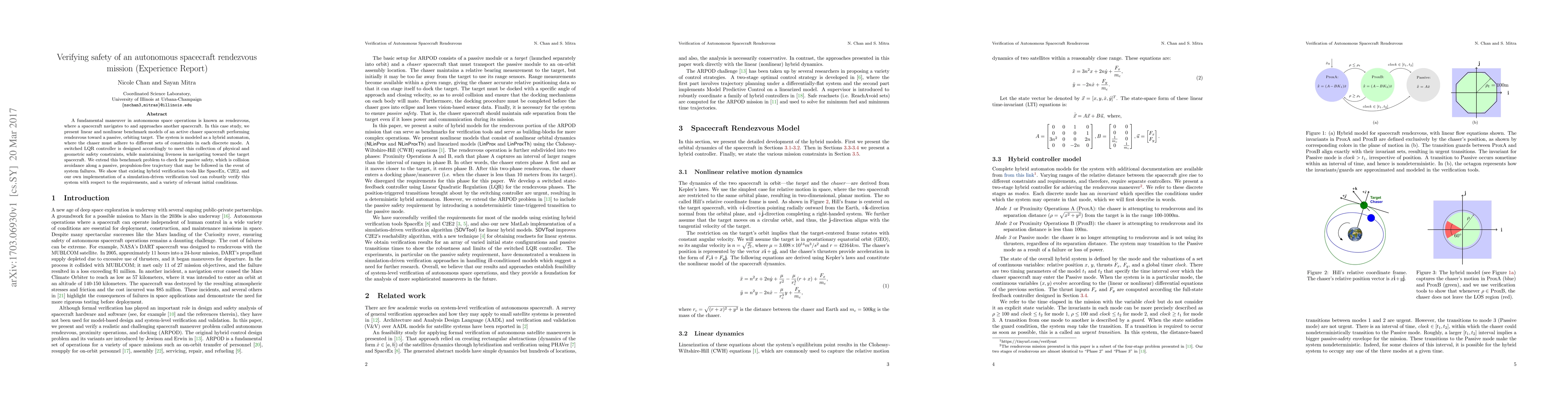 This paper presents models and a switched LQR controller for an autonomous spacecraft rendezvous mission, ensuring safety through hybrid automaton constraints and verification tools like SpaceEx and C2E2. It also extends the safety analysis to cover passive collision avoidance scenarios in case of system failures.