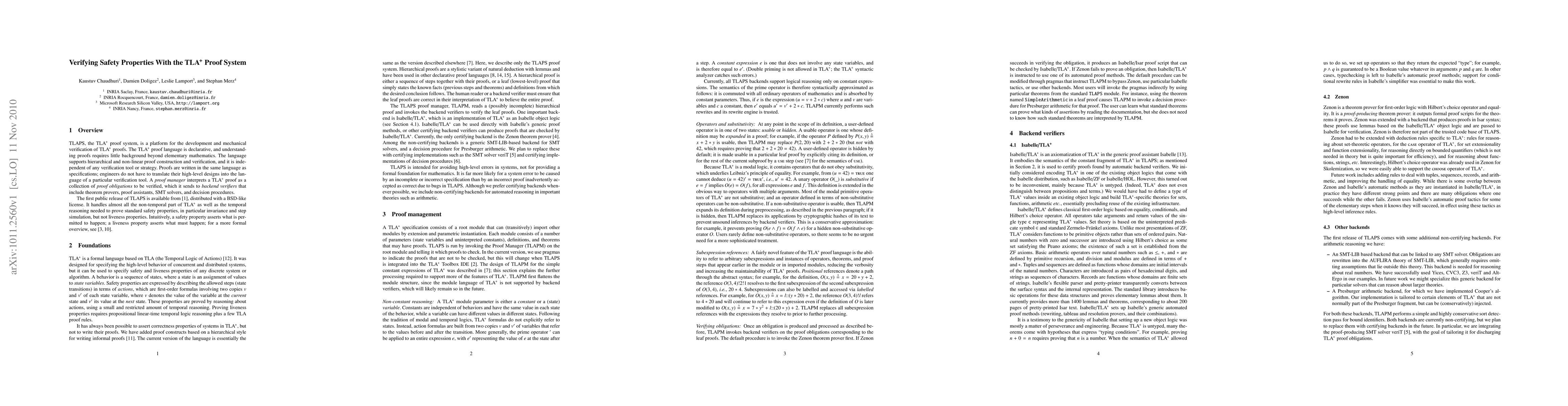This paper introduces TLAPS, a TLA+ proof system for verifying safety properties through mechanical means, utilizing various backend verifiers. It supports hierarchical and non-linear proof construction and is released under a BSD-like license.