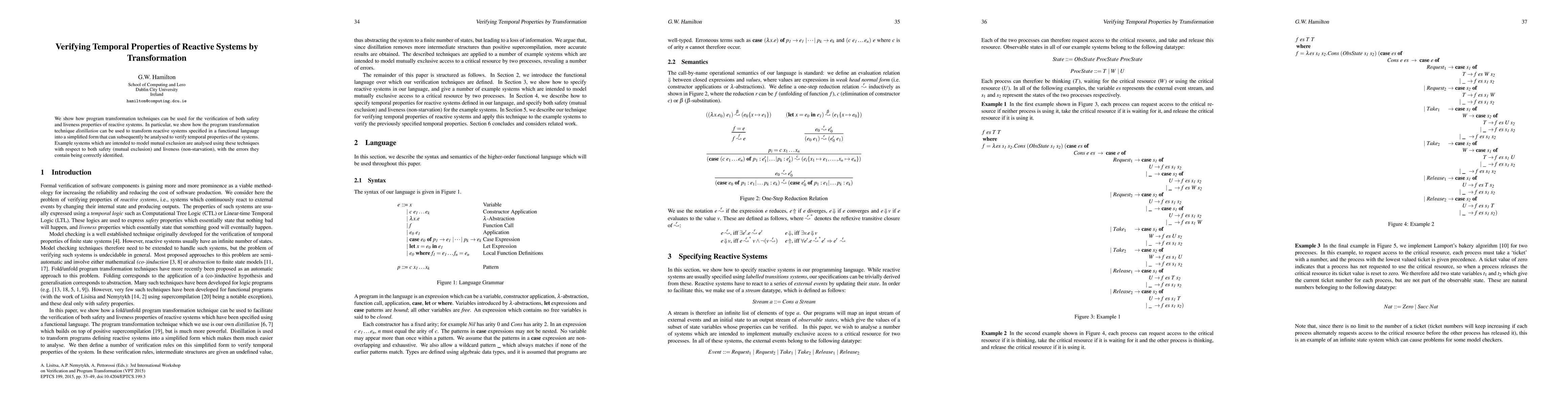 We show how program transformation techniques can be used for the verification of both safety and liveness properties of reactive systems. In particular, we show how the program transformation technique distillation can be used to transform reactive systems specified in a functional language into a simplified form that can subsequently be analysed to verify temporal properties of the systems. Example systems which are intended to model mutual exclusion are analysed using these techniques with respect to both safety (mutual exclusion) and liveness (non-starvation), with the errors they contain being correctly identified.