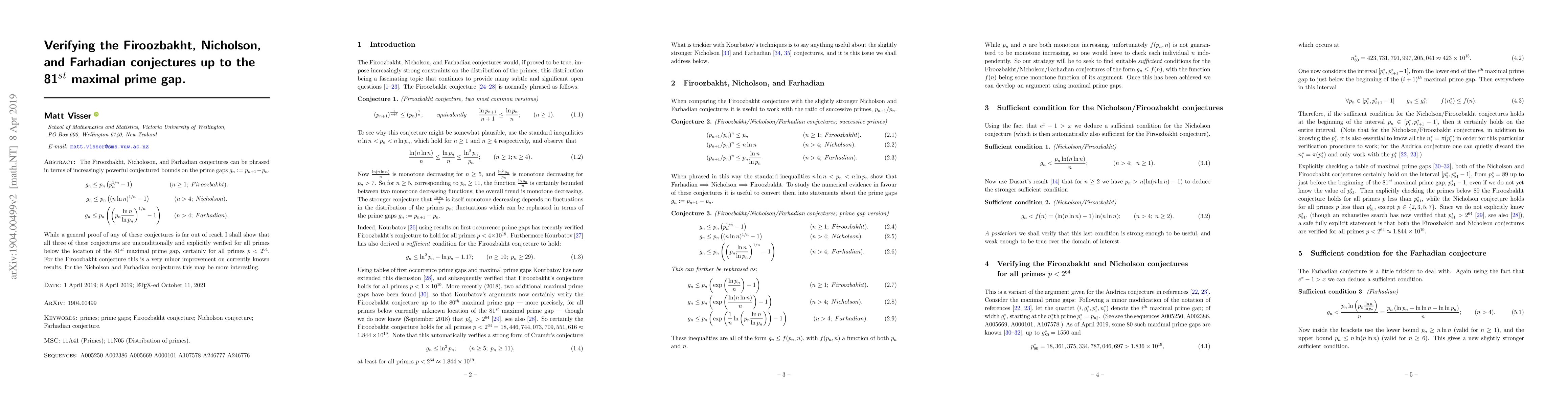 The Firoozbakht, Nicholoson, and Farhadian conjectures can be phrased in terms of increasingly powerful conjectured bounds on the prime gaps $g_n := p_{n+1}-p_n$. \[ g_n \leq p_n \left(p_n^{1/n} -1 \right)\qquad\qquad\qquad (n \geq 1; \; Firoozbakht). \] \[ g_n \leq p_n \left((n\ln n)^{1/n} -1 \right)\qquad\qquad (n>4; \; Nicholson). \] \[ g_n \leq p_n \left( \left(p_n {\ln n\over\ln p_n}\right)^{1/n} -1 \right)\qquad (n>4; \; Farhadian). \] While a general proof of any of these conjectures is far out of reach I shall show that all three of these conjectures are unconditionally and explicitly verified for all primes below the location of the 81$^{st}$ maximal prime gap, certainly for all primes $p <2^{64}$. For the Firoozbakht conjecture this is a very minor improvement on currently known results, for the Nicholson and Farhadian conjectures this may be more interesting.