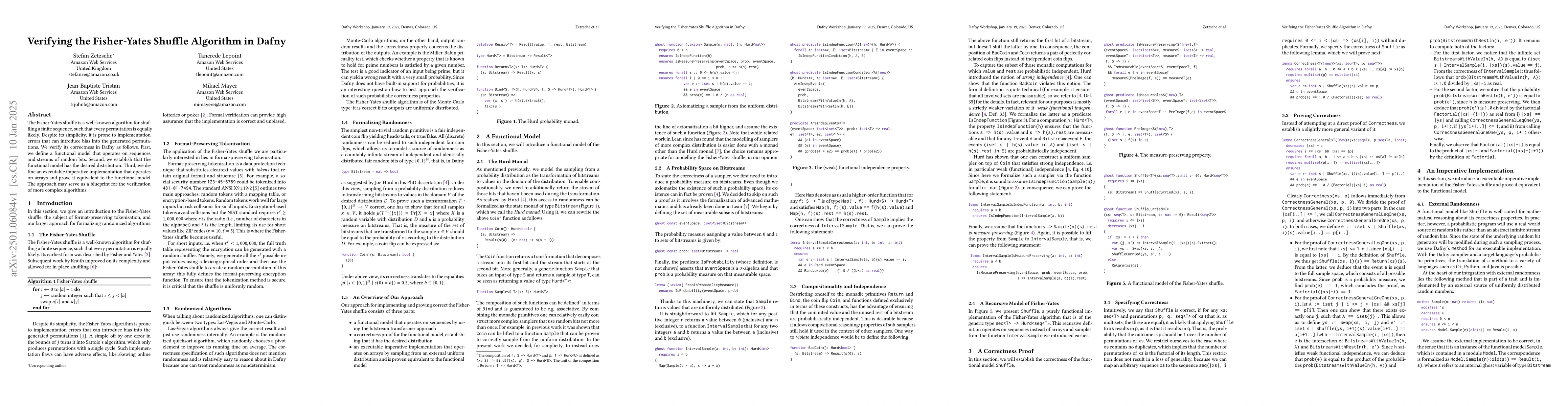 The paper verifies the Fisher-Yates shuffle algorithm's correctness in Dafny by defining a functional model and proving it has the desired distribution, then establishing equivalence to an imperative implementation. This method can guide verification of more complex algorithms.