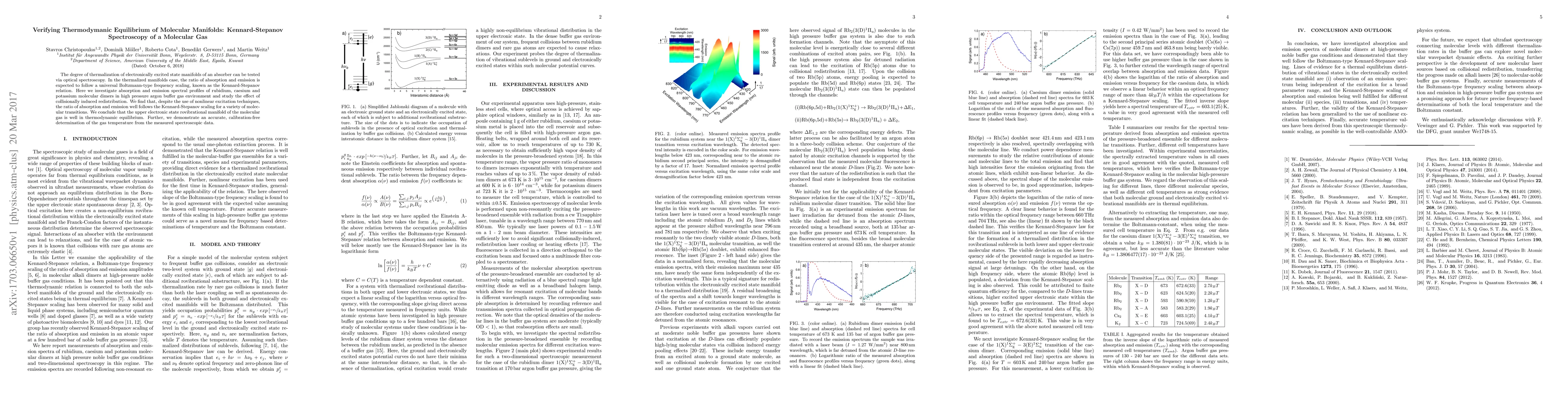 This paper investigates the thermodynamic equilibrium of electronically excited molecular manifolds using Kennard-Stepanov spectroscopy on rubidium, cesium, and potassium dimers. The study confirms that the absorption-to-emission ratio follows the Kennard-Stepanov relation, indicating thermodynamic equilibrium in the upper electronic state rovibrational manifold.