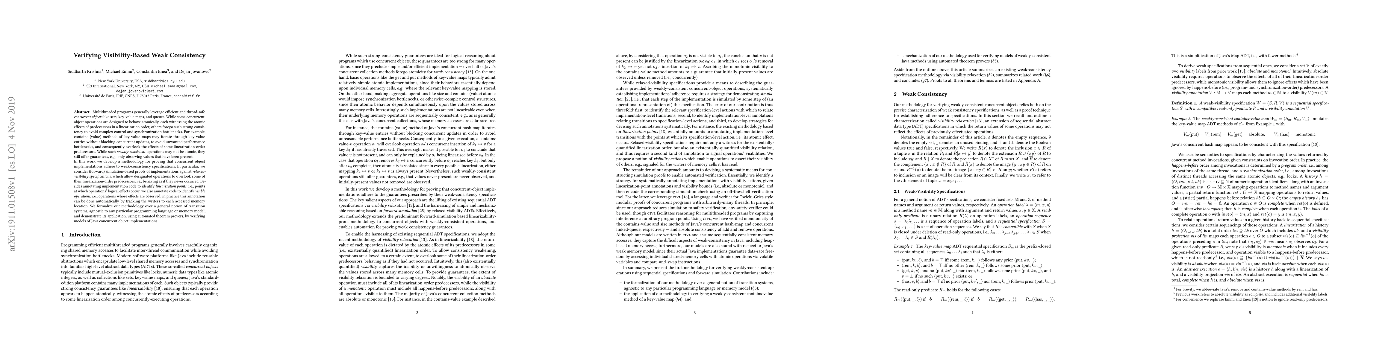 This paper presents a methodology for verifying weak-consistency in concurrent object implementations, focusing on simulation-based proofs against relaxed-visibility specifications. It uses annotations to identify linearization and visible operations, and demonstrates its approach through automated theorem proving applied to Java concurrent object models.